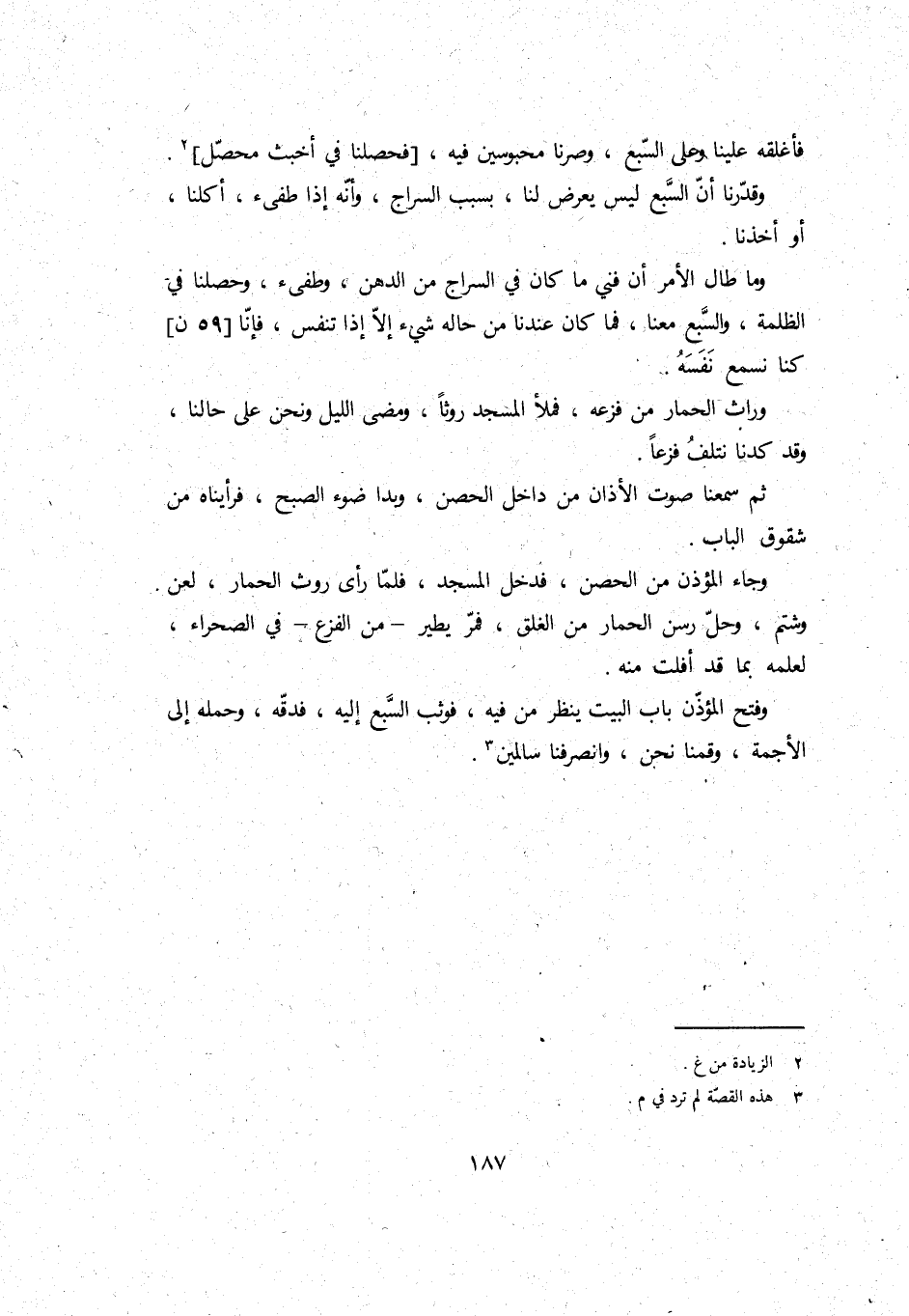ثمَّ سمعنَا صَوت الْأَذَان من دَاخل الْحصن، وبدا ضوء الصُّبْح، فرأيناه من شقوق الْبَاب.