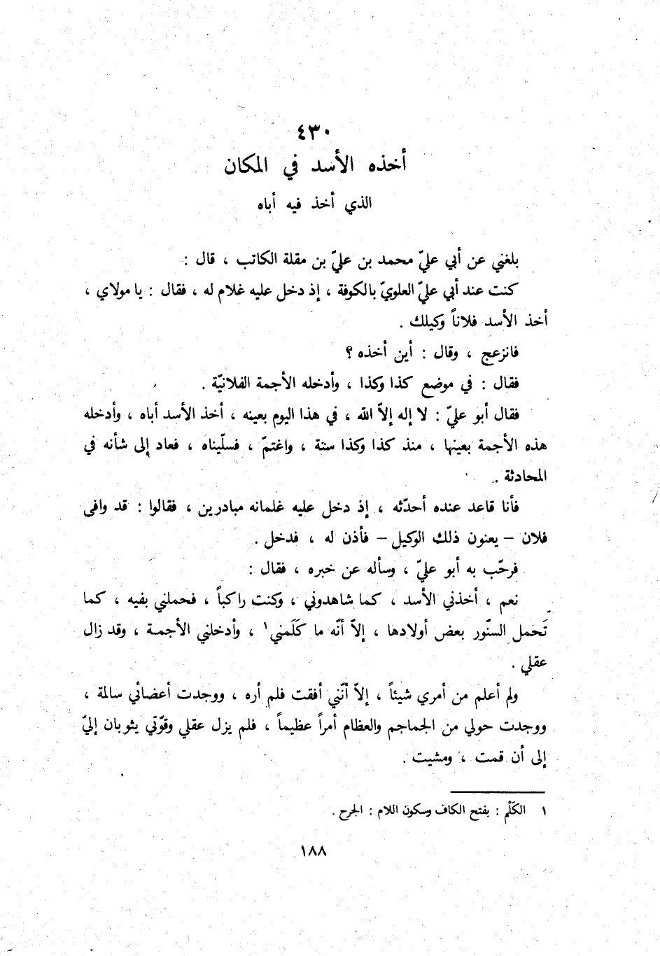 بَلغنِي عَن أبي عَليّ مُحَمَّد بن عَليّ بن مقلة الْكَاتِب، قَالَ: كنت عِنْد أبي عَليّ الْعلوِي بِالْكُوفَةِ، إِذْ دخل عَلَيْهِ غُلَام لَهُ، فَقَالَ: يَا مولَايَ، أَخذ الْأسد فلَانا وكيلك.