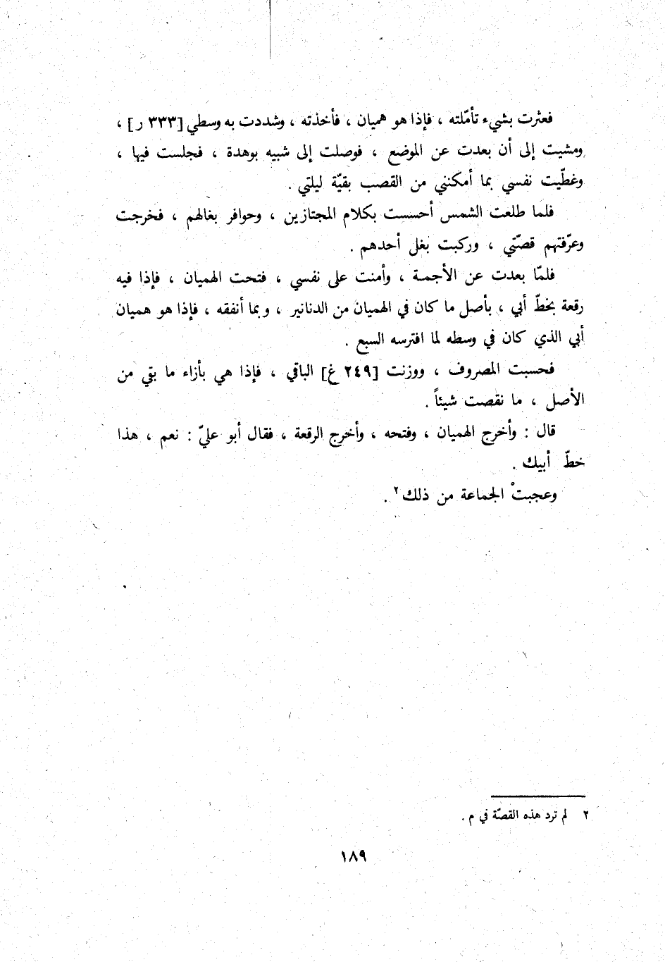 فَلَمَّا بَعدت عَن الأجمة، وَأمنت على نَفسِي، فتحت الْهِمْيَان، فَإِذا فِيهِ رقْعَة بِخَط أبي، بِأَصْل مَا كَانَ فِي الْهِمْيَان من الدَّنَانِير، وَبِمَا أنفقهُ، فَإِذا هُوَ هميان أبي الَّذِي كَانَ فِي وَسطه لما افترسه السَّبع.