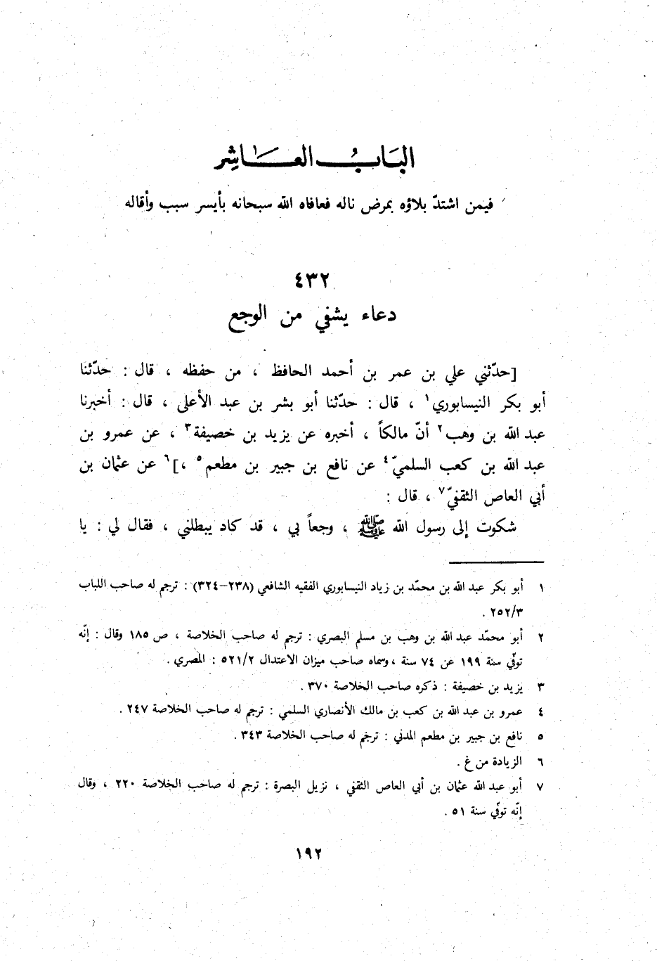 4: 192 54 - حَدَّثَنِي عَلِيُّ بْنُ عُمَرَ بْنِ أَحْمَدَ الْحَافِظُ، مِنْ حِفْظِهِ، قَالَ: حَدَّثَنَا أَبُو بَكْرٍ النَّيْسَابُورِيُّ، قَالَ: حَدَّثَنَا أَبُو بِشْرِ بْنُ عَبْدِ الأَعْلَى، قَالَ: أَخْبَرَنَا عَبْدُ اللَّهِ بْنُ وَهْبٍ، أَنَّ مَالِكًا، أَخْبَرَهُ عَنْ يَزِيدَ بْنِ خُصَيْفَةَ، عَنْ عَمْرِو بْنِ عَبْدِ اللَّهِ بْنِ كَعْبٍ السُّلَمِيِّ، عَنْ نَافِعِ بْنِ جُبَيْرِ بْنِ مُطْعِمٍ، عَنْ عُثْمَانَ بْنِ أَبِي الْعَاصِ الثَّقَفِيِّ، قَالَ: شَكَوْتُ إِلَى رَسُولِ اللَّهِ صَلَّى اللَّهُ عَلَيْهِ وَسَلَّمَ، وَجَعًا بِي، قَدْ كَادَ يُبْطِلُنِي، فَقَالَ لِي: يَا