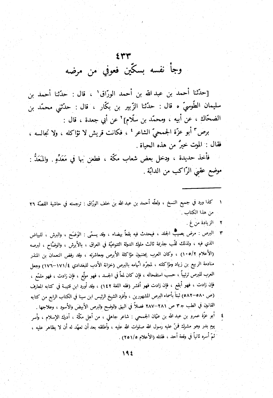 حَدثنَا أَحْمد بن عبد الله بن أَحْمد الْوراق، قَالَ: حَدثنَا أَحْمد بن سُلَيْمَان الطوسي، قَالَ: حَدثنَا الزبير بن بكار، قَالَ: حَدثنِي مُحَمَّد بن الضَّحَّاك، عَن أَبِيه، وَمُحَمّد بن سَلام، عَن أبي جعدة، قَالَ: برص أَبُو عزة الجُمَحِي الشَّاعِر، فَكَانَت قُرَيْش لَا تؤاكله، وَلَا تجالسه، فَقَالَ: الْمَوْت خير من هَذِه الْحَيَاة.