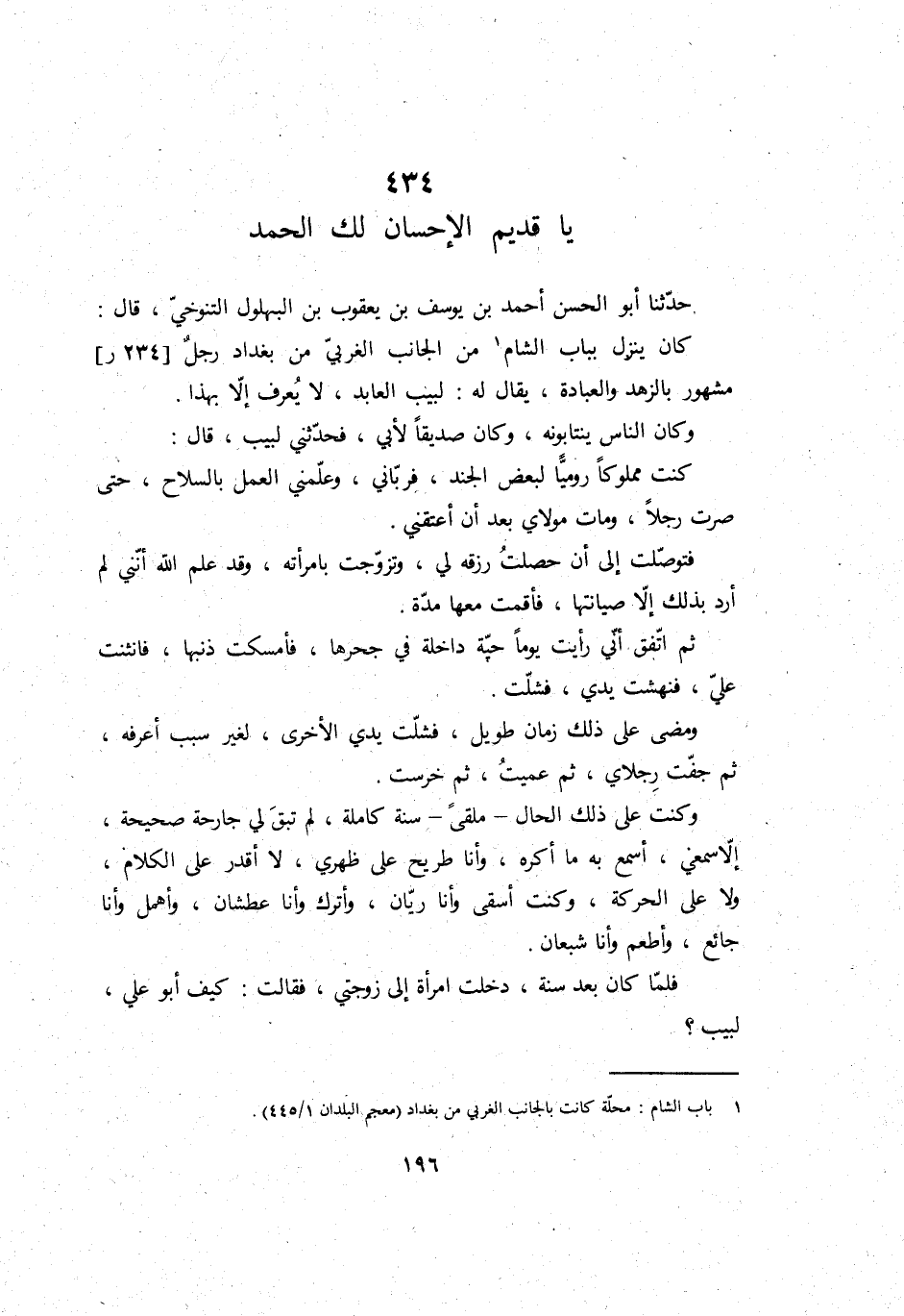 حَدثنَا أَبُو الْحسن أَحْمد بن يُوسُف بن يَعْقُوب بن البهلول التنوخي، قَالَ: كَانَ ينزل بِبَاب الشَّام من الْجَانِب الغربي من بَغْدَاد رجل مَشْهُور بالزهد وَالْعِبَادَة، يُقَال لَهُ: لَبِيب العابد، لَا يعرف إِلَّا بِهَذَا.