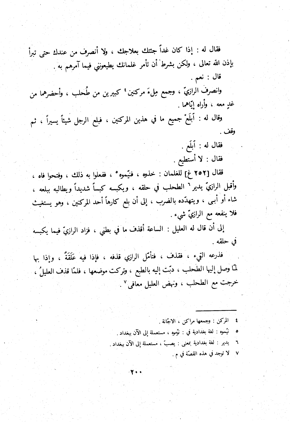 فَقَالَ للغلمان: خذوه، فنيموه، فَفَعَلُوا بِهِ ذَلِك، وفتحوا فَاه، وَأَقْبل الرَّازِيّ يُدِير الطحلب فِي حلقه، ويكبسه كبسًا شَدِيدا ويطالبه ببلعه، شَاءَ أَو أَبى، ويتهدده بِالضَّرْبِ، إِلَى أَن بلع كَارِهًا أحد المركنين، وَهُوَ يستغيث فَلَا يَنْفَعهُ مَعَ الرَّازِيّ شَيْء.