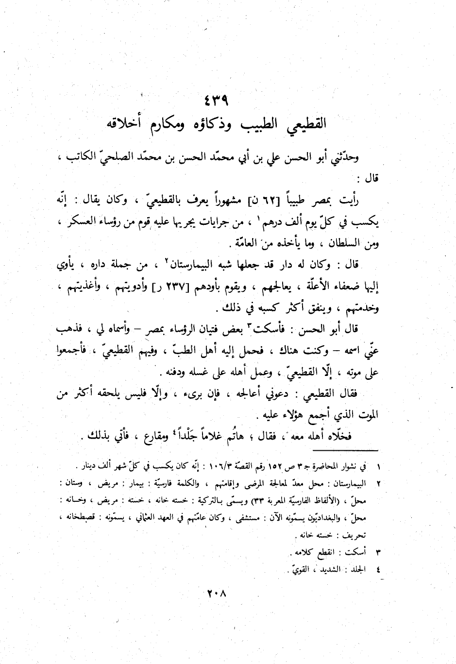 وحَدثني أَبُو الْحسن عَليّ بن أبي مُحَمَّد الْحسن بن مُحَمَّد الصلحي الْكَاتِب، قَالَ: رَأَيْت بِمصْر طَبِيبا مَشْهُورا يعرف بالقطيعي، وَكَانَ يُقَال: إِنَّه يكْسب فِي كل يَوْم ألف دِرْهَم، من جرايات يجريها عَلَيْهِ قوم من رُؤَسَاء الْعَسْكَر، وَمن السُّلْطَان، وَمَا يَأْخُذهُ من الْعَامَّة.