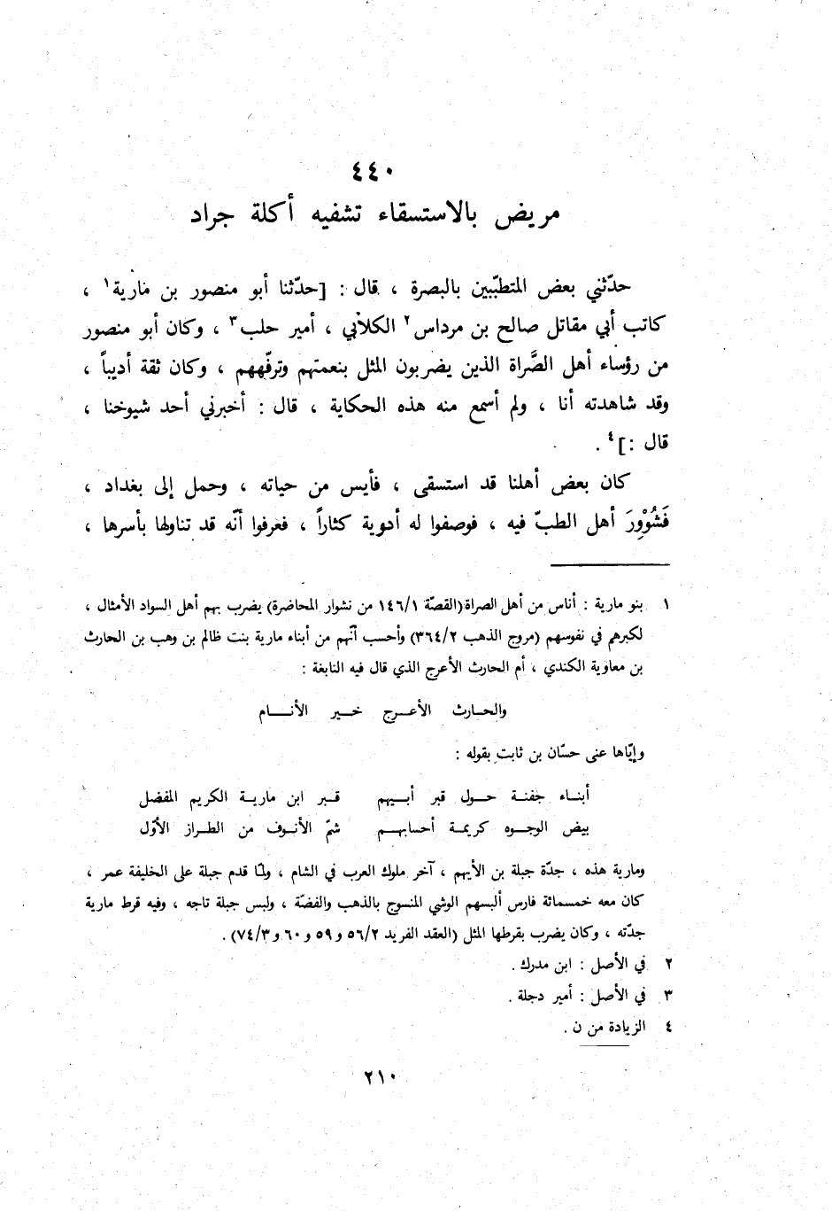 حَدثنِي بعض المتطببين بِالْبَصْرَةِ، قَالَ: حَدثنَا أَبُو مَنْصُور بن مَارِيَة، كَاتب أبي مقَاتل صَالح بن مرداس الْكلابِي، أَمِير حلب، وَكَانَ أَبُو مَنْصُور من رُؤَسَاء أهل الصراة الَّذين يضْربُونَ الْمثل بنعمتهم وترفههم، وَكَانَ ثِقَة أديبًا، وَقد شاهدته أَنا، وَلم أسمع مِنْهُ هَذِه الْحِكَايَة، قَالَ: أَخْبرنِي أحد شُيُوخنَا، قَالَ: كَانَ بعض أهلنا قد استسقى، فأيس من حَيَاته، وَحمل إِلَى بَغْدَاد، فشوور أهل الطِّبّ فِيهِ، فوصفوا لَهُ أدوية كثارًا، فعرفوا أَنه قد تنَاولهَا بأسرها،