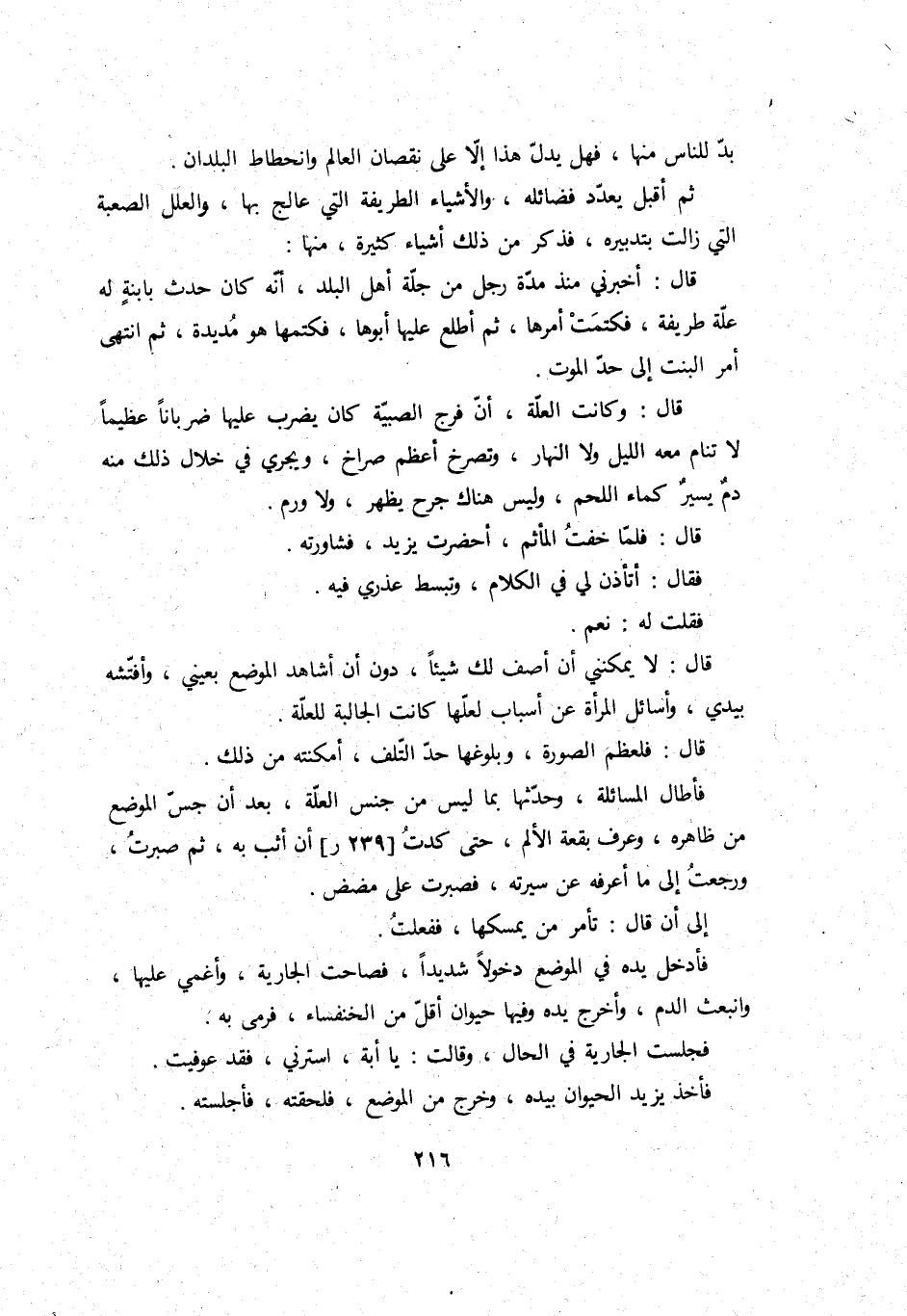 فَأطَال المسائلة، وحدثها بِمَا لَيْسَ من جنس الْعلَّة، بعد أَن جس الْموضع من ظَاهره، وَعرف بقْعَة الْأَلَم، حَتَّى كدت أَن أثب بِهِ، ثمَّ صبرت، وَرجعت إِلَى مَا أعرفهُ عَن سيرته، فَصَبَرت على مضض.