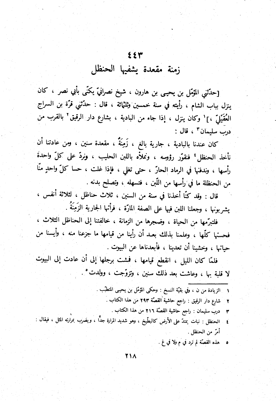 حَدثنِي المؤمل بن يحيى بن هَارُون، شيخ نَصْرَانِيّ يكنى بِأبي نصر، كَانَ ينزل بِبَاب الشَّام، رَأَيْته فِي سنة خمسين وثلثمائة، قَالَ: حَدثنِي قُرَّة بن السراج الْعقيلِيّ، وَكَانَ ينزل، إِذا جَاءَ من الْبَادِيَة، بشارع دَار الرَّقِيق بِالْقربِ من درب سُلَيْمَان، قَالَ: كَانَ عندنَا بالبادية، جَارِيَة بَالغ، زمنة، مقعدة سِنِين، وَمن عادتنا أَن نَأْخُذ الحنظل فنقور رءوسه، ونملأه بِاللَّبنِ الحليب، ونرد على كل وَاحِدَة رَأسهَا، وندفنها فِي الرماد الْحَار، حَتَّى تغلي، فَإِذا غلت، حسا كل وَاحِد منا من الحنظلة مَا فِي رَأسهَا من اللَّبن، فتسهله، وَتصْلح بدنه.