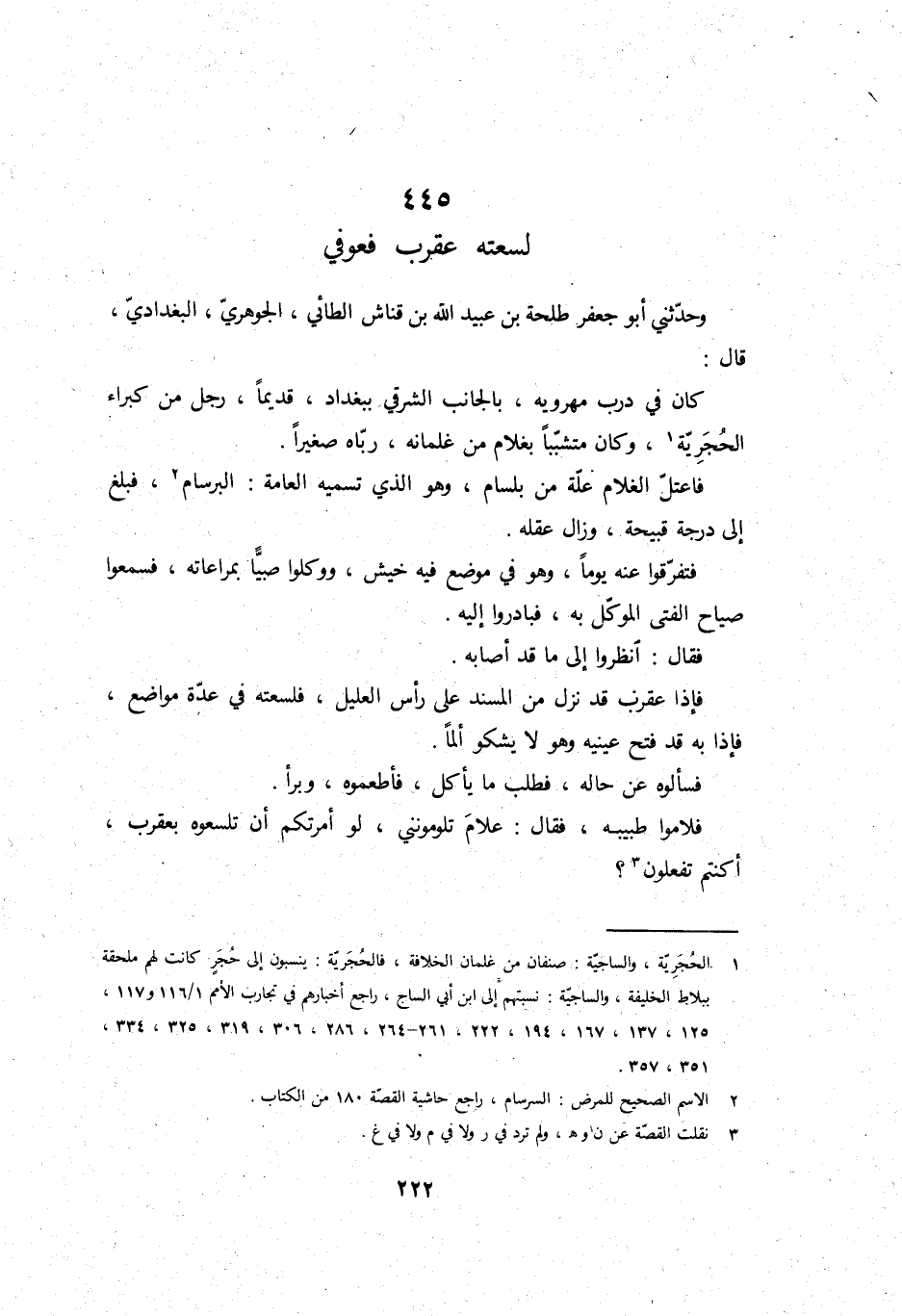 فَإِذا عقرب قد نزل من الْمسند على رَأس العليل، فلسعته فِي عدَّة مَوَاضِع، فَإِذا بِهِ قد فتح عَيْنَيْهِ وَهُوَ لَا يشكو ألمًا.