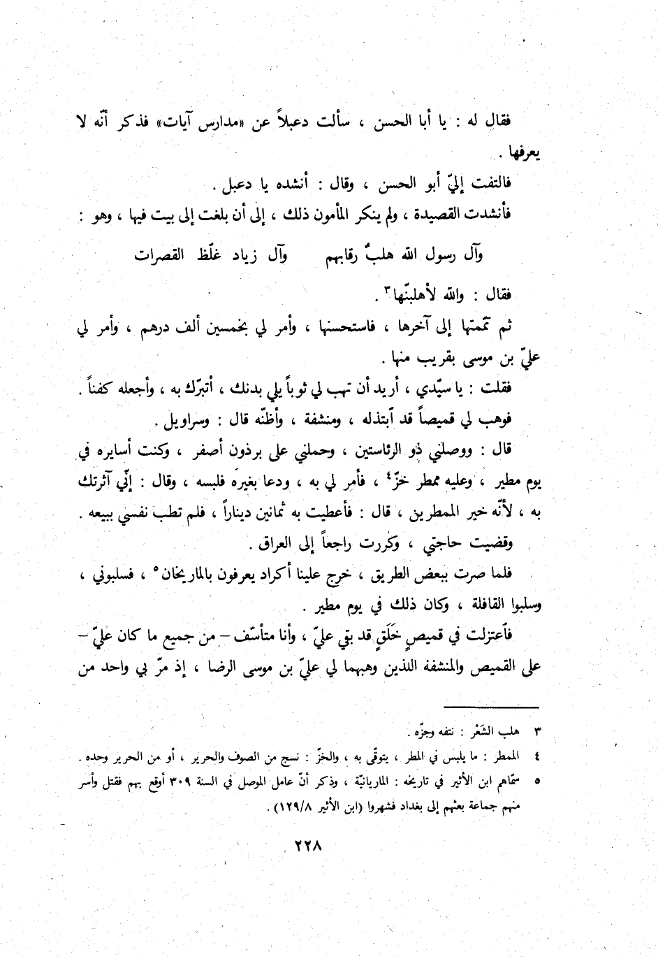 فاعتزلت فِي قَمِيص خلق قد بَقِي عَليّ، وَأَنا متأسف، من جَمِيع مَا كَانَ عَليّ، على الْقَمِيص والمنشفة اللَّذين وهبهما لي عَليّ بن مُوسَى الرِّضَا، إِذْ مر بِي وَاحِد من