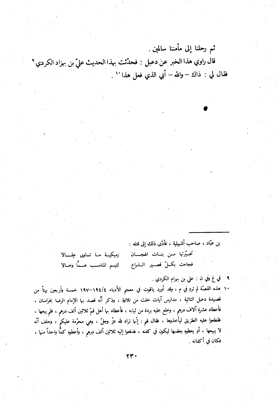 قَالَ رَاوِي هَذَا الْخَبَر عَن دعبل: فَحدثت بِهَذَا الحَدِيث عَليّ بن بهزاد الْكرْدِي فَقَالَ لي: ذَاك، وَالله، أبي الَّذِي فعل هَذَا.