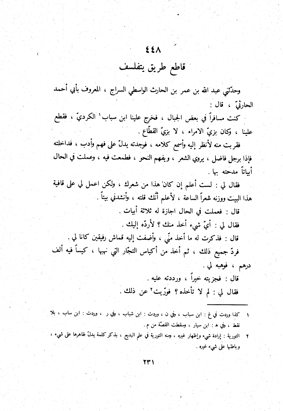 وحَدثني عبد الله بن عمر بن الْحَارِث الوَاسِطِيّ السراج، الْمَعْرُوف بِأبي أَحْمد الْحَارِثِيّ، قَالَ: كنت مُسَافِرًا فِي بعض الْجبَال، فَخرج علينا ابْن سباب الْكرْدِي، فَقطع علينا، وَكَانَ بزِي الْأُمَرَاء، لَا بزِي القطاع.