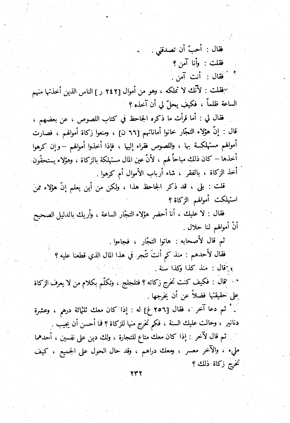 قلت: بلَى، قد ذكر الجاحظ هَذَا، وَلَكِن من أَيْن يعلم إِن هَؤُلَاءِ مِمَّن استهلكت أَمْوَالهم الزَّكَاة؟ فَقَالَ: لَا عَلَيْك، أَنا أحضر هَؤُلَاءِ التُّجَّار السَّاعَة، وأريك بِالدَّلِيلِ الصَّحِيح أَن أَمْوَالهم لنا حَلَال.