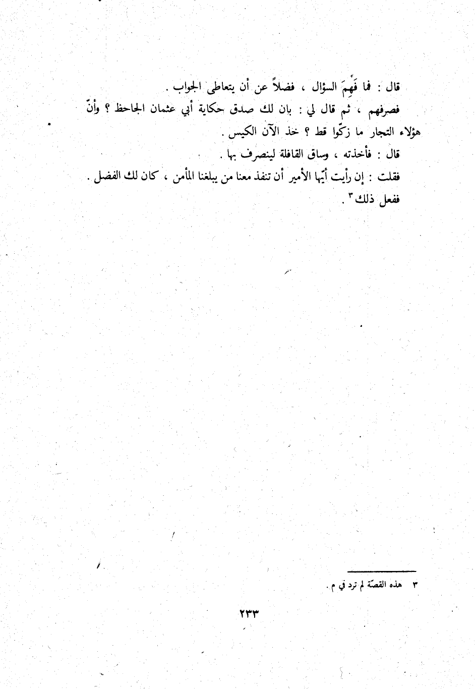 فصرفهم، ثمَّ قَالَ لي: بَان لَك صدق حِكَايَة أبي عُثْمَان الجاحظ؟ وَأَن هَؤُلَاءِ التُّجَّار مَا زكوا قطّ؟ خُذ الْآن الْكيس.