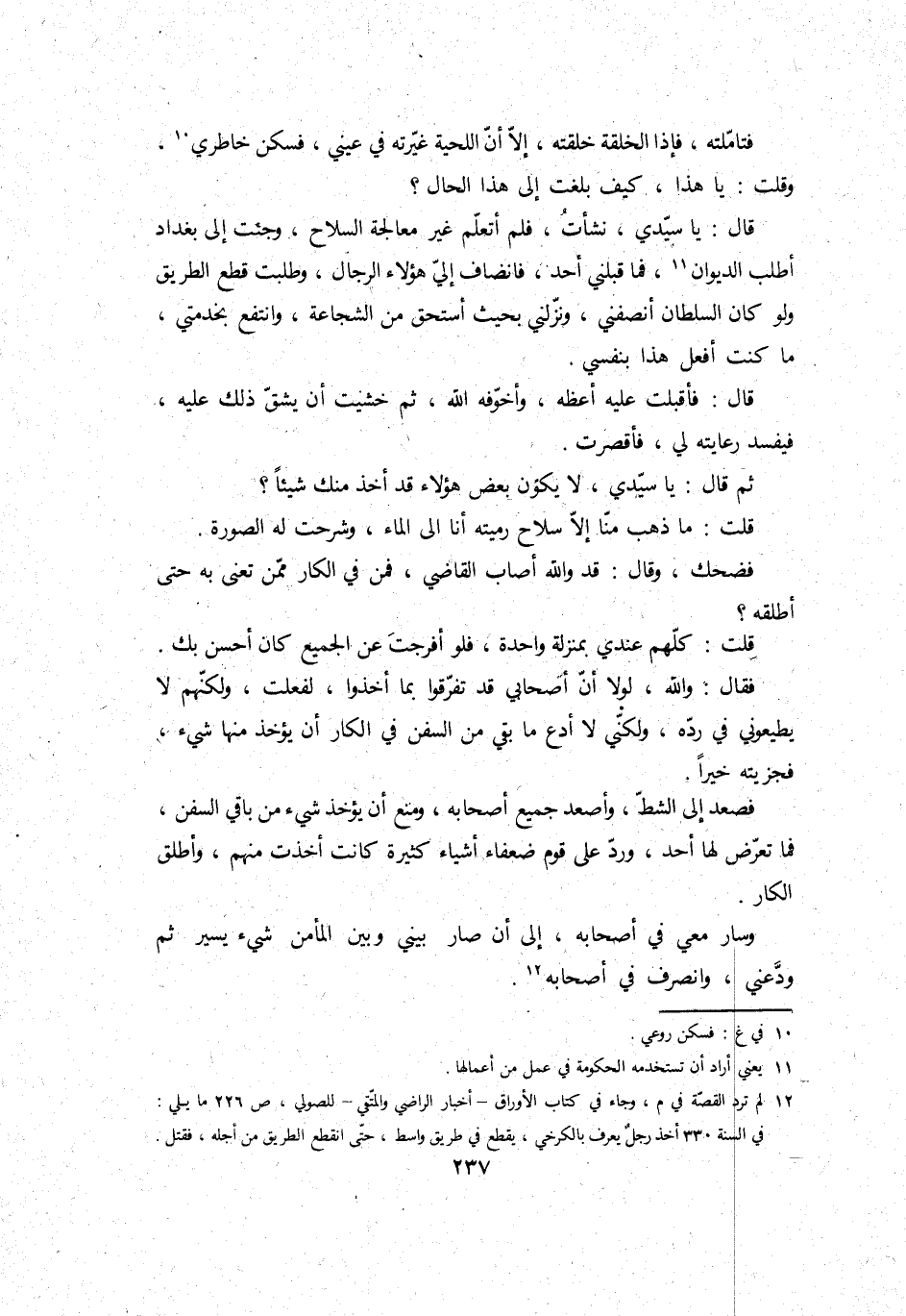 فتأملته، فَإِذا الْخلقَة خلقته، إِلَّا أَن اللِّحْيَة غيرته فِي عَيْني، فسكن خاطري، وَقلت: يَا هَذَا، كَيفَ بلغت إِلَى هَذَا الْحَال؟ قَالَ: يَا سَيِّدي، نشأت، فَلم أتعلم غير معالجة السِّلَاح، وَجئْت إِلَى بَغْدَاد أطلب الدِّيوَان، فَمَا قبلني أحد، فانضاف إِلَيّ هَؤُلَاءِ الرِّجَال، وَطلبت قطع الطَّرِيق وَلَو كَانَ السُّلْطَان أنصفني، ونزلني بِحَيْثُ أستحق من الشجَاعَة، وانتفع بخدمتي، مَا كنت أفعل هَذَا بنفسي.