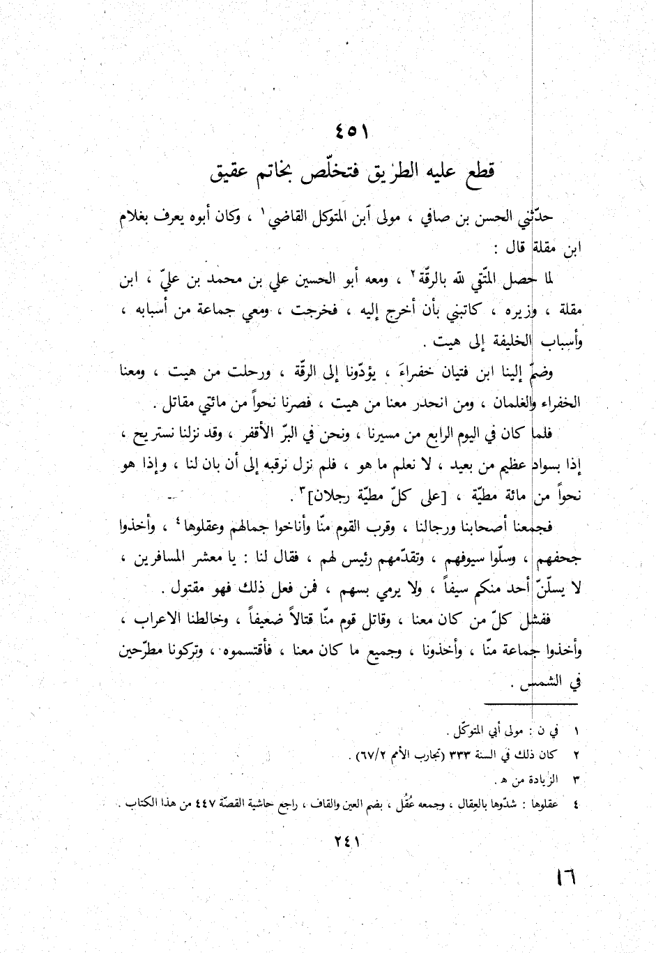 حَدثنِي الْحسن بن صافي، مولى ابْن المتَوَكل القَاضِي، وَكَانَ أَبوهُ يعرف بِغُلَام ابْن مقلة قَالَ: لما حصل المتقي لله بالرقة، وَمَعَهُ أَبُو الْحُسَيْن عَليّ بن مُحَمَّد بن عَليّ، ابْن مقلة، وزيره، كاتبني بِأَن أخرج إِلَيْهِ، فَخرجت، وَمَعِي جمَاعَة من أَسبَابه، وَأَسْبَاب الْخَلِيفَة إِلَى هيت.