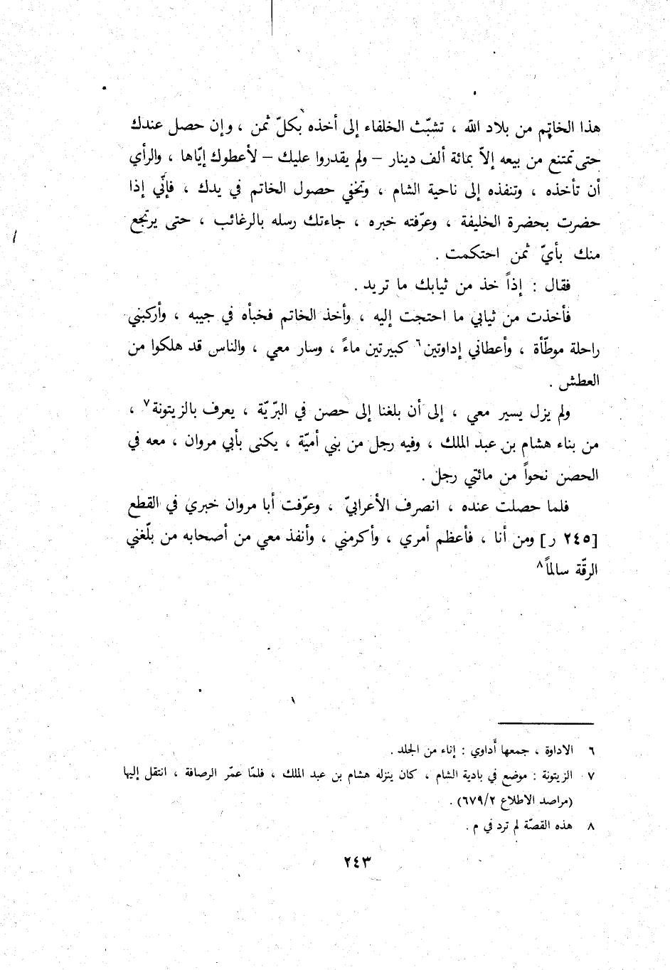 وَلم يزل يسير معي، إِلَى أَن بلغنَا إِلَى حصن فِي الْبَريَّة، يعرف بالزيتونة، من بِنَاء هِشَام بن عبد الْملك، وَفِيه رجل من بني أُميَّة، يكنى بِأبي مَرْوَان، مَعَه فِي الْحصن نَحوا من مِائَتي رجل.