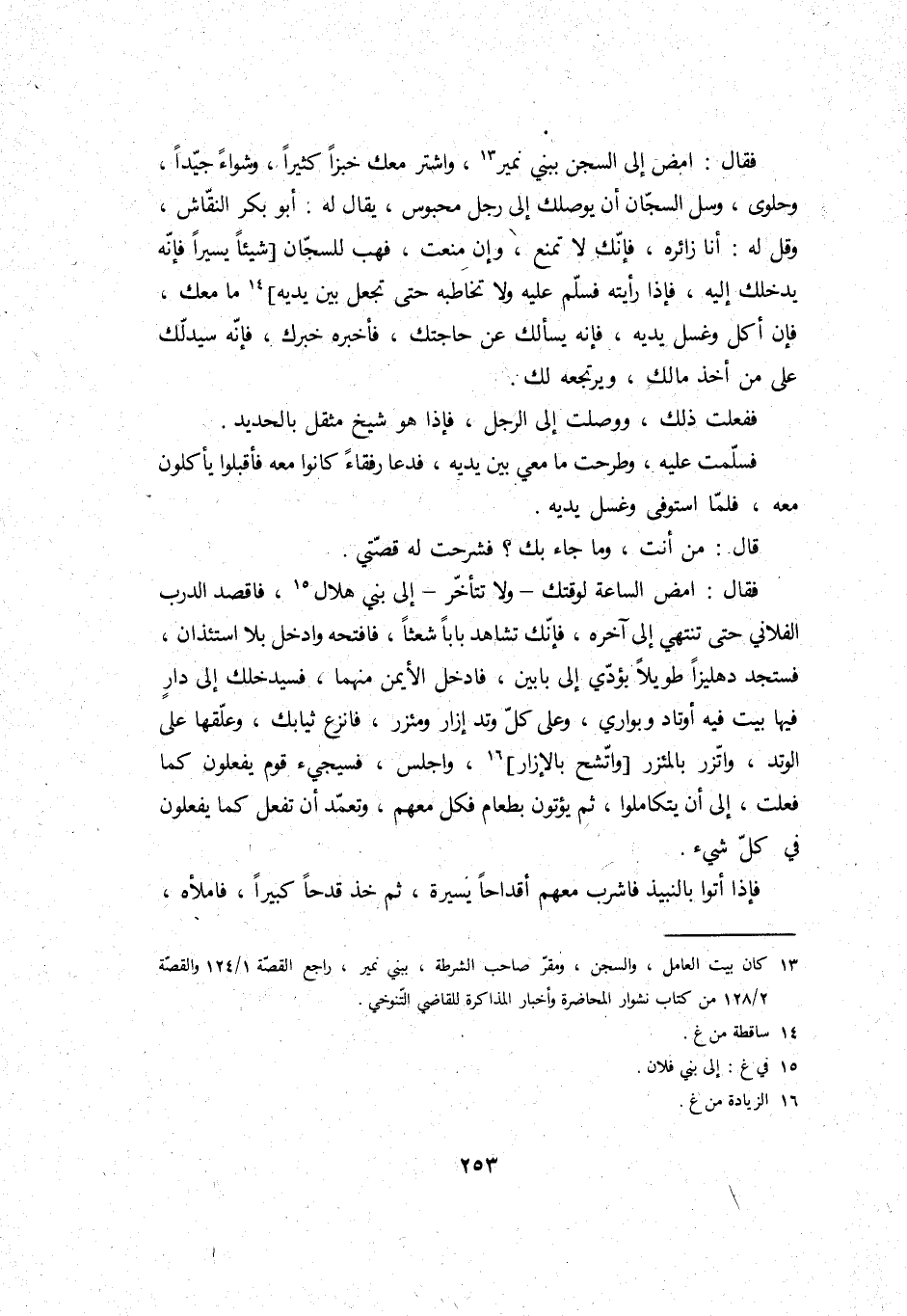 فَقَالَ: امْضِ إِلَى السجْن ببني نمير، واشتر مَعَك خبْزًا كثيرا، وشواءً جيدا، وحلوى، وسل السجان أَن يوصلك إِلَى رجل مَحْبُوس، يُقَال لَهُ: أَبُو بكر النقاش، وَقل لَهُ: أَنا زَائِره، فَإنَّك لَا تمنع، وَإِن منعت، فَهَب للسجان شَيْئا يَسِيرا فَإِنَّهُ يدْخلك إِلَيْهِ، فَإِذا رَأَيْته فَسلم عَلَيْهِ وَلَا تخاطبه حَتَّى تجْعَل بَين يَدَيْهِ مَا مَعَك، فَإِن أكل وَغسل يَدَيْهِ، فَإِنَّهُ يَسْأَلك عَن حَاجَتك، فَأخْبرهُ خبرك، فَإِنَّهُ سيدلك على من أَخذ مَالك، ويرتجعه لَك.