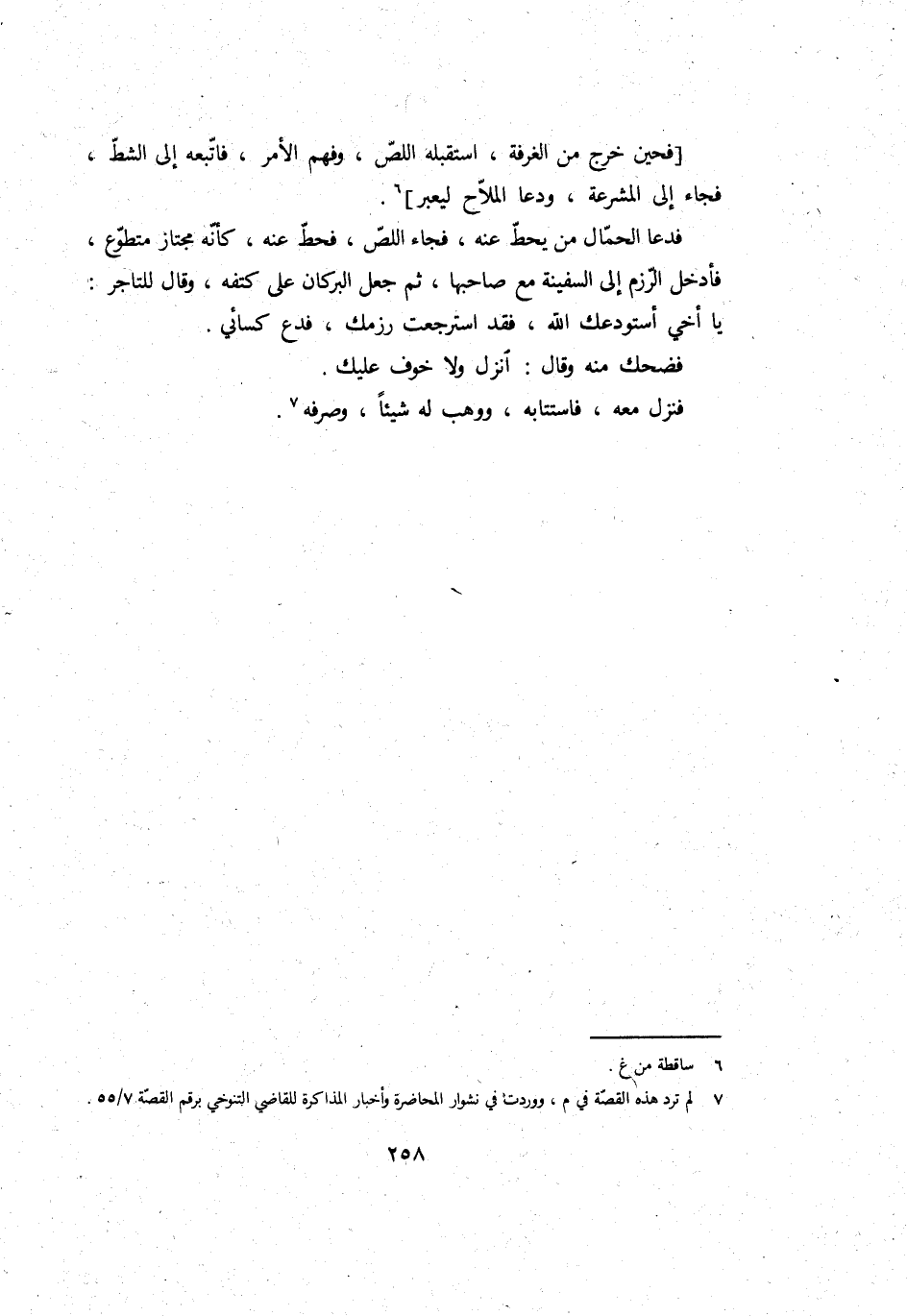 فحين خرج من الغرفة، استقبله اللص، وَفهم الْأَمر، فَاتبعهُ إِلَى الشط، فجَاء إِلَى المشرعة، ودعا الملاح ليعبر.