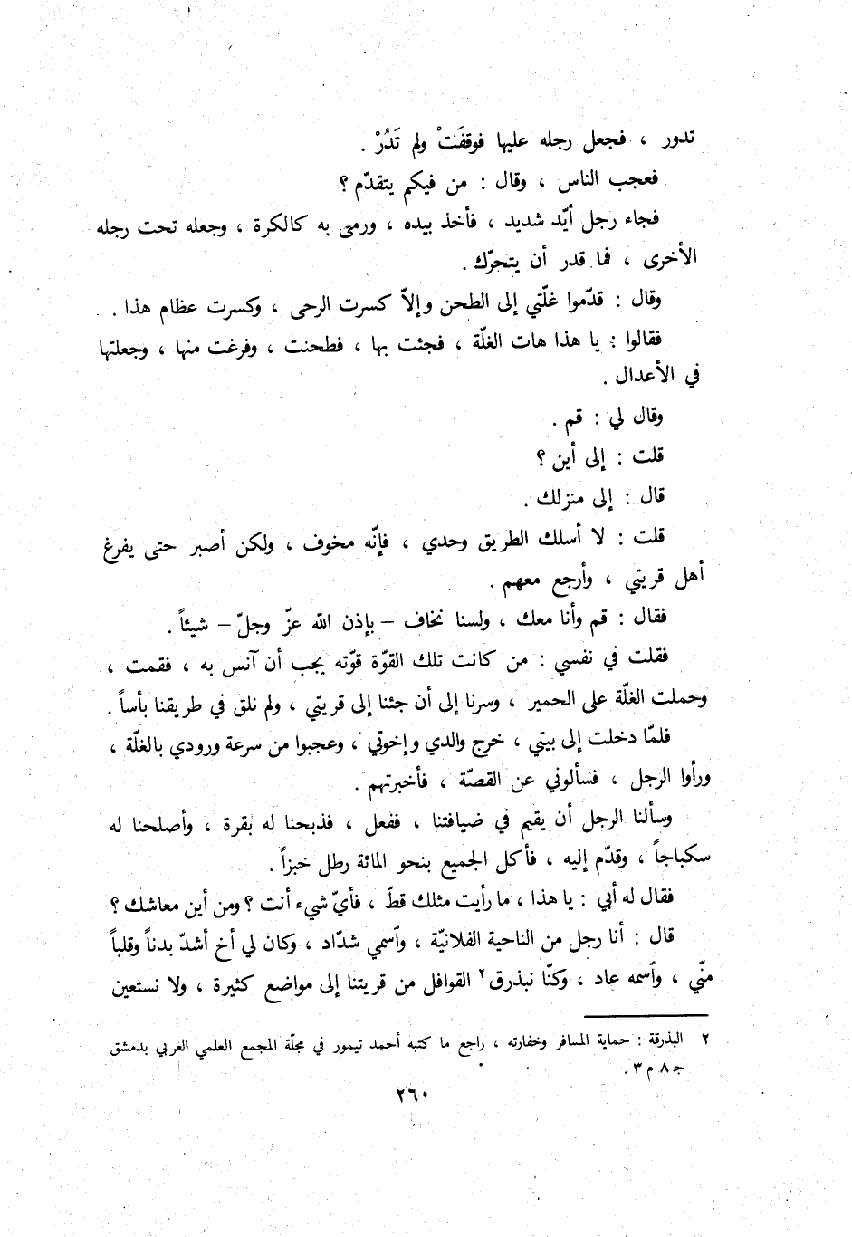 فَقلت فِي نَفسِي: من كَانَت تِلْكَ الْقُوَّة قوته يجب أَن آنس بِهِ، فَقُمْت، وحملت الْغلَّة على الْحمير، وسرنا إِلَى أَن جِئْنَا إِلَى قريتي، وَلم نلق فِي طريقنا بَأْسا.