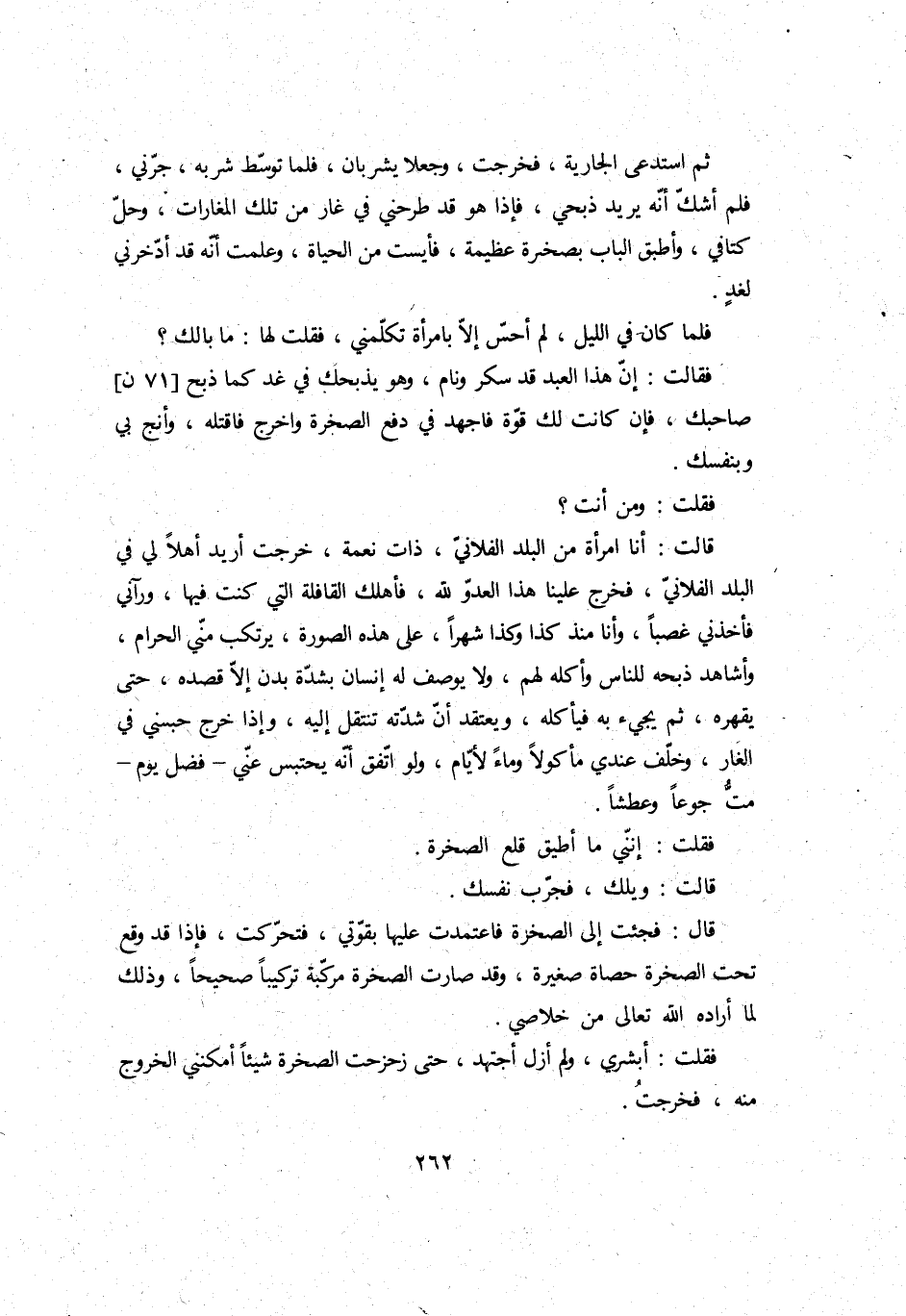 فَقلت: وَمن أَنْت؟ قَالَت: أَنا امْرَأَة من الْبَلَد الْفُلَانِيّ، ذَات نعْمَة، خرجت أُرِيد أَهلا لي فِي الْبَلَد الْفُلَانِيّ، فَخرج علينا هَذَا الْعَدو لله، فَأهْلك الْقَافِلَة الَّتِي كنت فِيهَا، ورآني فأخذني غصبا، وَأَنا مُنْذُ كَذَا وَكَذَا شهرا، على هَذِه الصُّورَة، يرتكب مني الْحَرَام، وأشاهد ذبحه للنَّاس وَأكله لَهُم، وَلَا يُوصف لَهُ إِنْسَان بِشدَّة بدن إِلَّا قَصده، حَتَّى يَقْهَرهُ، ثمَّ يَجِيء بِهِ فيأكله، ويعتقد أَن شدته تنْتَقل إِلَيْهِ، وَإِذا خرج حَبَسَنِي فِي الْغَار، وَخلف عِنْدِي مَأْكُولا وَمَاء لأيام، وَلَو اتّفق أَنه يحتبس عني، فضل يَوْم، مت جوعا وعطشًا.