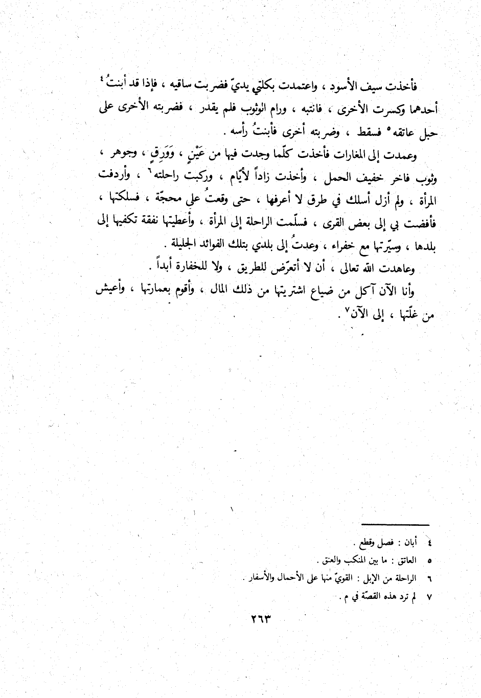 وعمدت إِلَى المغارات فَأخذت كلما وجدت فِيهَا من عين، وورق، وجوهر، وثوب فاخر خَفِيف الْحمل، وَأخذت زادًا لأيام، وَركبت رَاحِلَته، وأردفت الْمَرْأَة، وَلم أزل أسلك فِي طرق لَا أعرفهَا، حَتَّى وَقعت على محجة، فسلكتها، فأفضت بِي إِلَى بعض الْقرى، فَسلمت الرَّاحِلَة إِلَى الْمَرْأَة، وأعطيتها نَفَقَة تكفيها إِلَى بَلَدهَا، وسيرتها مَعَ خفراء، وعدت إِلَى بلدي بِتِلْكَ الْفَوَائِد الجليلة.