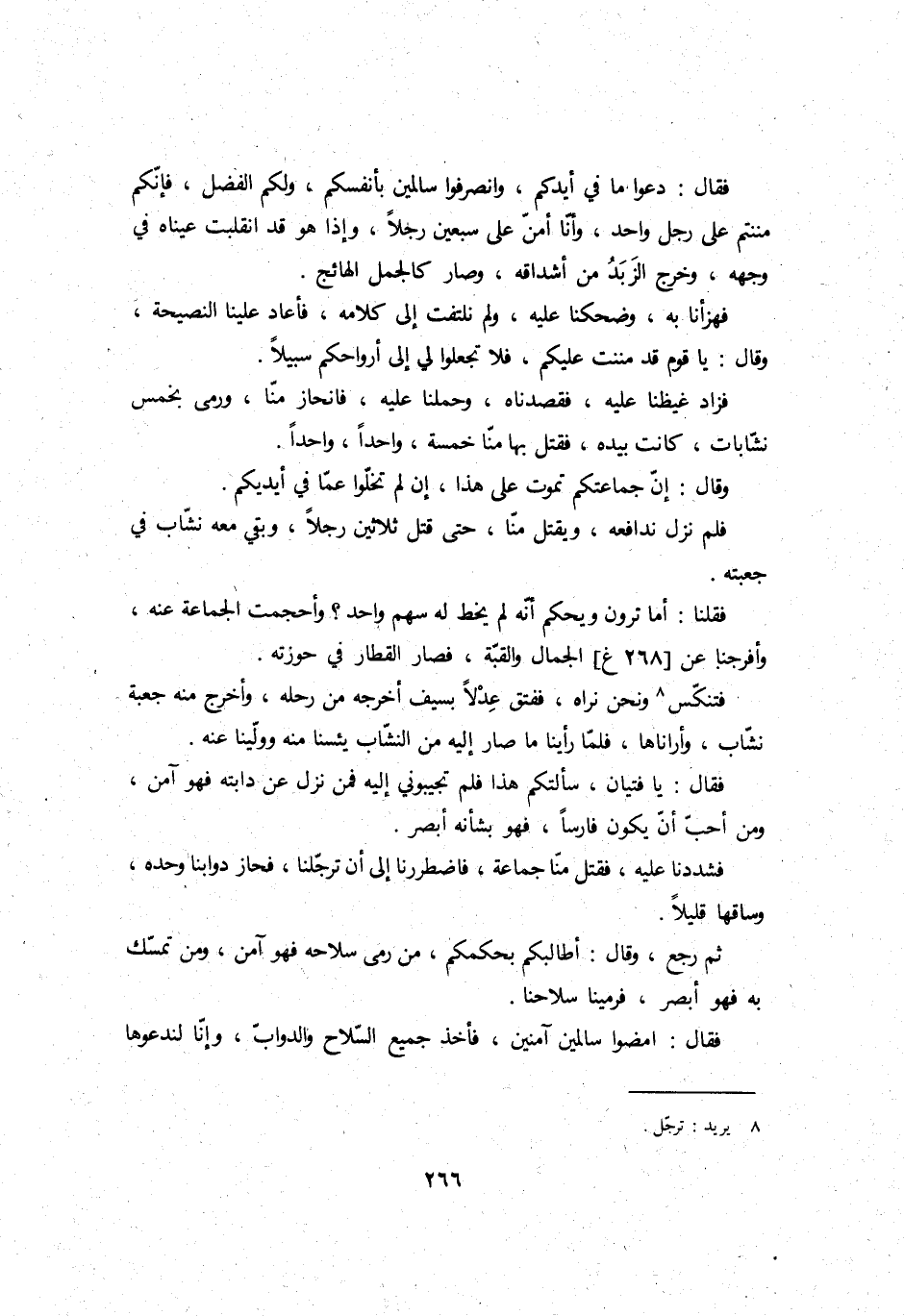 فَقُلْنَا: أما ترَوْنَ وَيحكم أَنه لم يخط لَهُ سهم وَاحِد؟ وأحجمت الْجَمَاعَة عَنهُ، وأفرجنا عَن الْجمال والقبة، فَصَارَ القطار فِي حوزته.