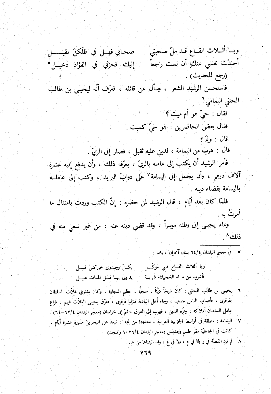 فَاسْتحْسن الرشيد الشّعْر، وَسَأَلَ عَن قَائِله، فَعرف أَنه ليحيى بن طَالب الْحَنَفِيّ اليمامي.