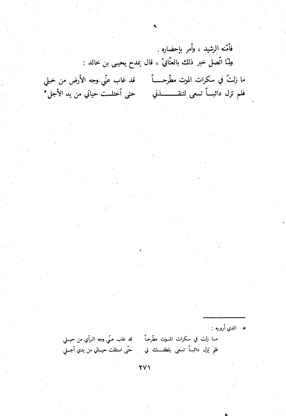 وَلما اتَّصل خبر ذَلِك بالعتابي، قَالَ يمدح يحيى بن خَالِد: