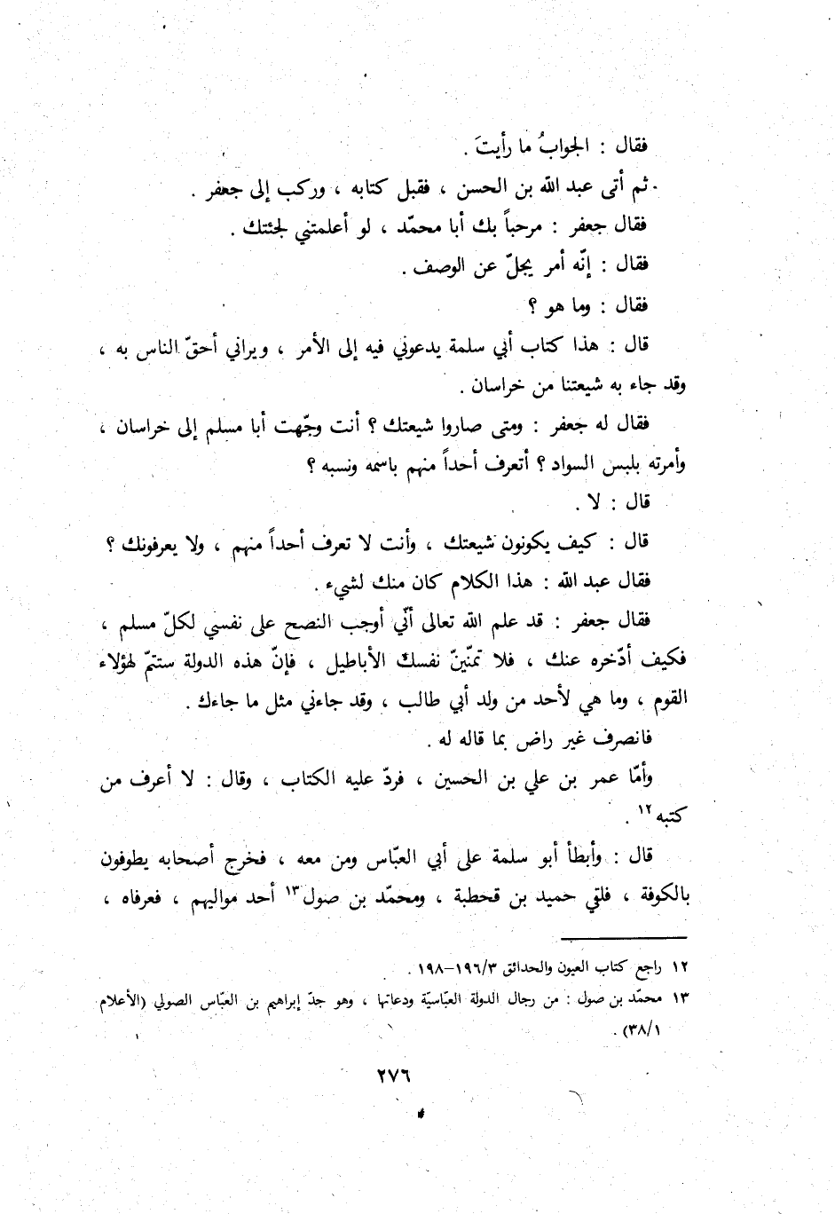 فَقَالَ لَهُ جَعْفَر: وَمَتى صَارُوا شيعتك؟ أَنْت وجهت أَبَا مُسلم إِلَى خُرَاسَان، وأمرته بِلبْس السوَاد؟ أتعرف أحدا مِنْهُم باسمه وَنسبه؟ قَالَ: لَا.