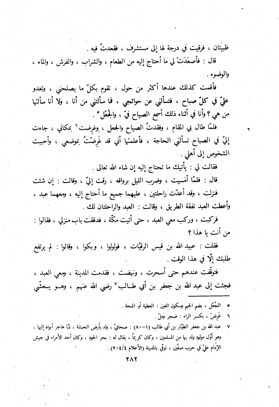 فتوقفت عِنْدهم حَتَّى أسحرت، ونهضت، فَقدمت الْمَدِينَة، وَمَعِي العَبْد، فَجئْت إِلَى عبد الله بن جَعْفَر بن أبي طَالب رَضِي الله عَنْهُم، وَهُوَ يعشي