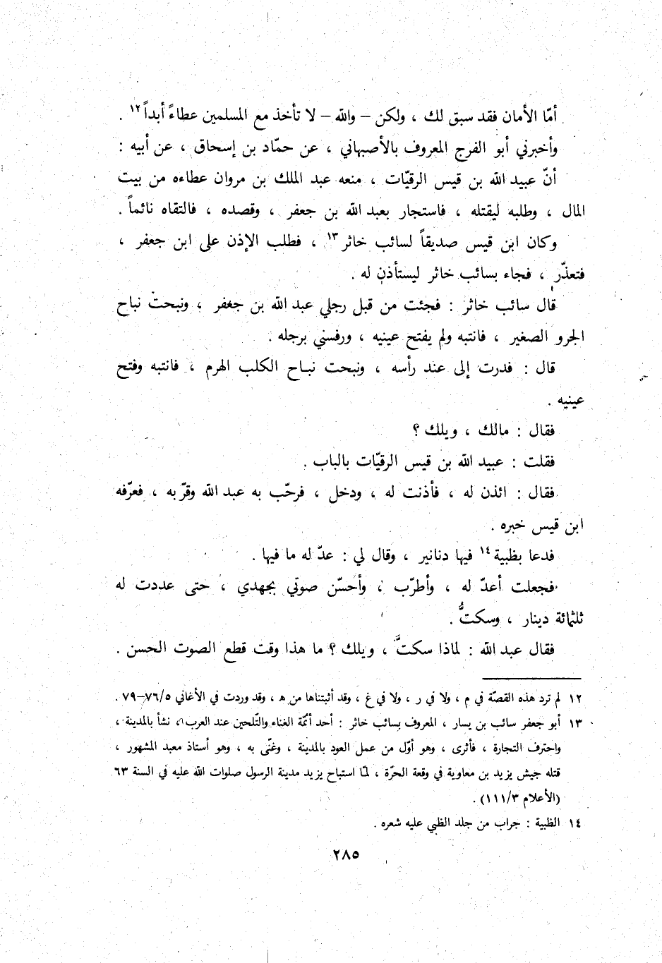 وَأَخْبرنِي أَبُو الْفرج الْمَعْرُوف بالأصبهاني، عَن حَمَّاد بن إِسْحَاق، عَن أَبِيه: أَن عبيد الله بن قيس الرقيات، مَنعه عبد الْملك بن مَرْوَان عطاءه من بَيت المَال، وَطَلَبه ليَقْتُلهُ، فَاسْتَجَارَ بِعَبْد الله بن جَعْفَر، وقصده، فالتقاه نَائِما.