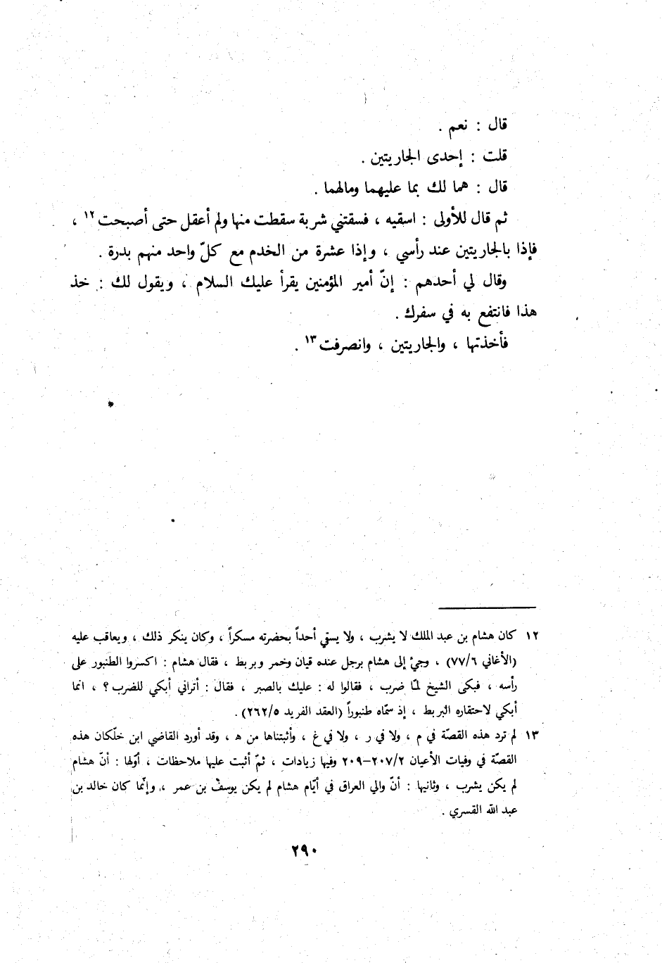ثمَّ قَالَ للأولى: اسقيه، فسقتني شربة سَقَطت مِنْهَا وَلم أَعقل حَتَّى أَصبَحت، فَإِذا بالجاريتين عِنْد رَأْسِي، وَإِذا عشرَة من الخدم مَعَ كل وَاحِد مِنْهُم بدرة.