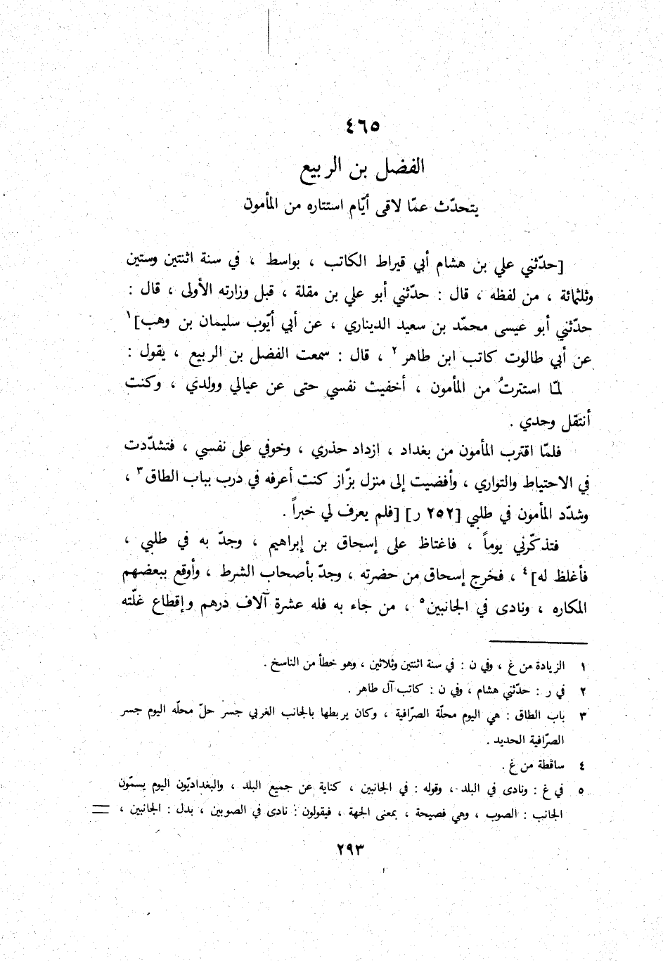 حَدثنِي عَليّ بن هِشَام أبي قِيرَاط الْكَاتِب، بواسط، فِي سنة اثْنَتَيْنِ وَسِتِّينَ وَثَلَاث مائَة، من لَفظه، قَالَ: حَدثنِي أَبُو عَليّ بن مقلة، قبل وزارته الأولى، قَالَ: حَدثنِي أَبُو عِيسَى مُحَمَّد بن سعيد الديناري، عَن أبي أَيُّوب سُلَيْمَان بن وهب عَن أبي طالوت كَاتب ابْن طَاهِر، قَالَ: سَمِعت الْفضل بن الرّبيع، يَقُول: لما استترت من الْمَأْمُون، أخفيت نَفسِي حَتَّى عَن عيالي وَوَلَدي، وَكنت أنتقل وحدي.