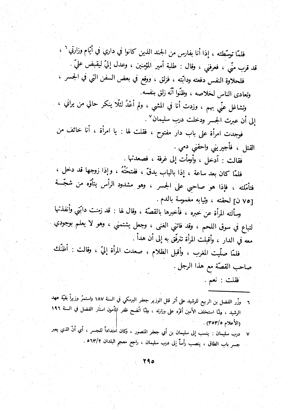 فَلَمَّا توسطته، إِذا أَنا بِفَارِس من الْجند الَّذين كَانُوا فِي دَاري فِي أَيَّام وزارتي، قد قرب مني، فعرفني، وَقَالَ: طلبة أَمِير الْمُؤمنِينَ، وَعدل إِلَيّ ليقْبض عَليّ.