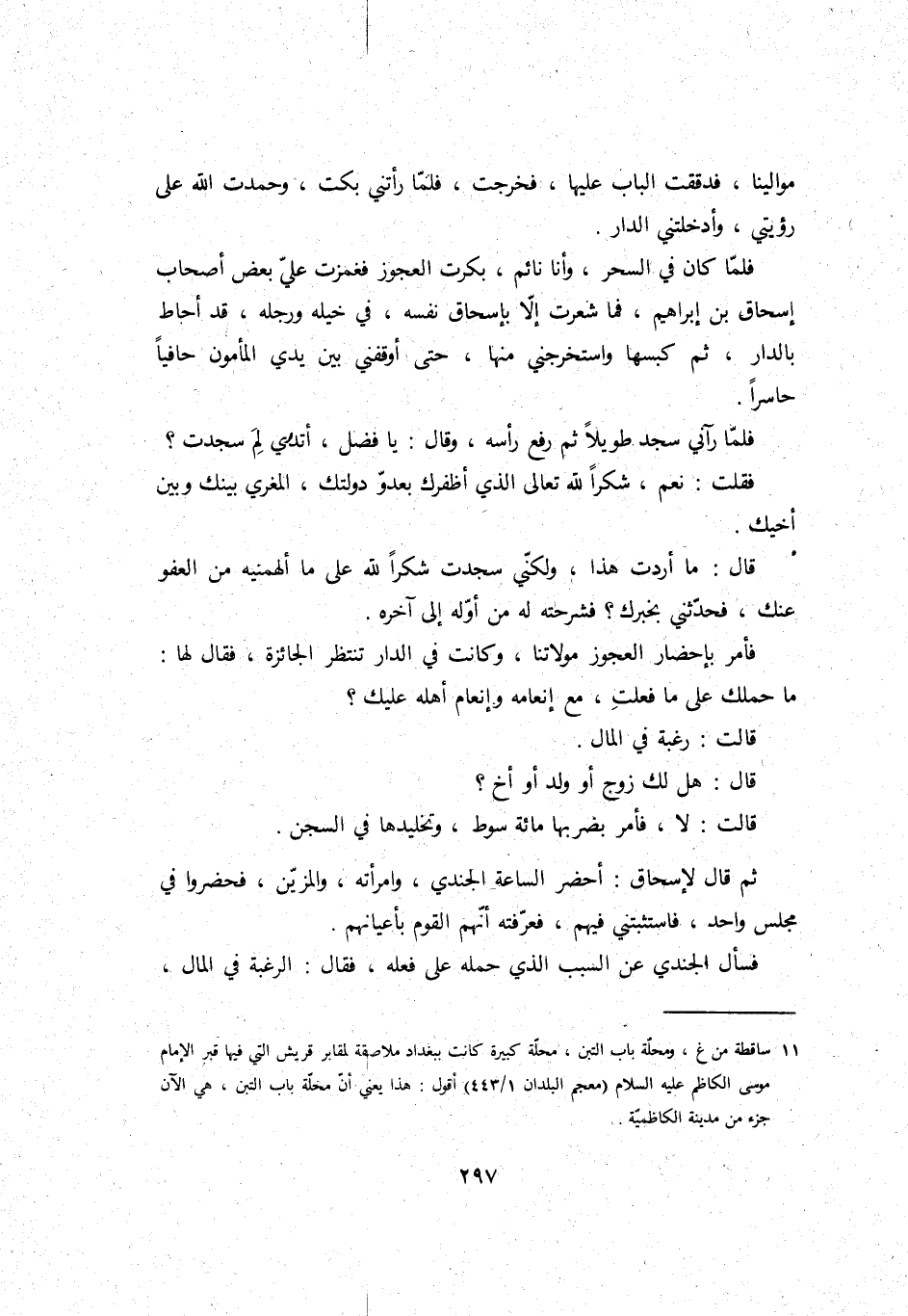 ثمَّ قَالَ لإسحاق: أحضر السَّاعَة الجندي، وَامْرَأَته، والمزين، فَحَضَرُوا فِي مجْلِس وَاحِد، فاستثبتني فيهم، فعرفته أَنهم الْقَوْم بأعيانهم.