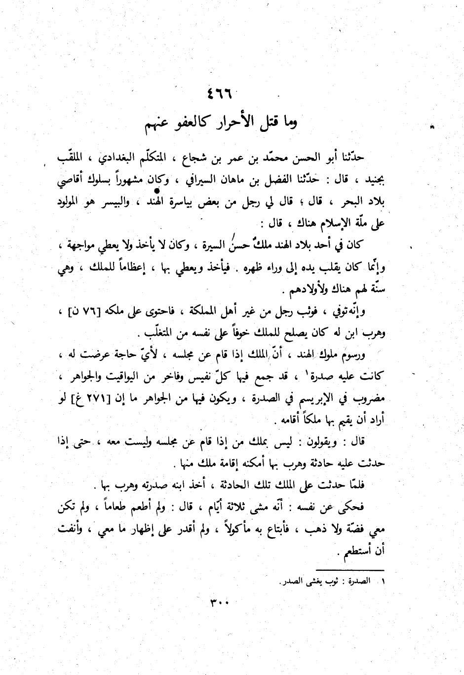 حَدثنَا أَبُو الْحسن مُحَمَّد بن عمر بن شُجَاع، الْمُتَكَلّم الْبَغْدَادِيّ، الملقب بجنيد، قَالَ: حَدثنَا الْفضل بن ماهان السيرافي، وَكَانَ مَشْهُورا بسلوك أقاصي بِلَاد الْبَحْر، قَالَ؛ قَالَ لي رجل من بعض بياسرة الْهِنْد، والبيسر هُوَ الْمَوْلُود على مِلَّة الْإِسْلَام هُنَاكَ، قَالَ: كَانَ فِي أحد بِلَاد الْهِنْد ملك حسن السِّيرَة، وَكَانَ لَا يَأْخُذ وَلَا يُعْطي مُوَاجهَة، وَإِنَّمَا كَانَ يقلب يَده إِلَى وَرَاء ظَهره.