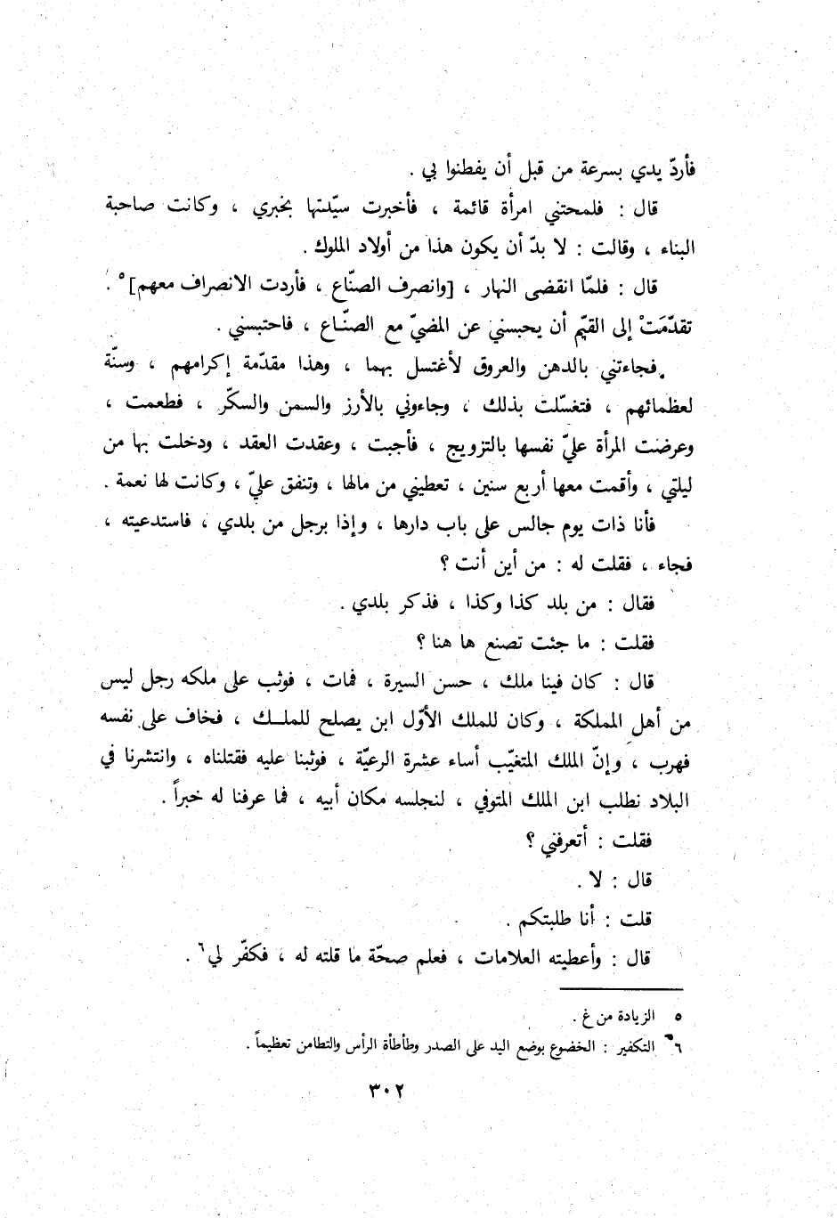 فَقلت: مَا جِئْت تصنع هَاهُنَا؟ قَالَ: كَانَ فِينَا ملك، حسن السِّيرَة، فَمَاتَ، فَوَثَبَ على ملكه رجل لَيْسَ من أهل المملكة، وَكَانَ للْملك الأول ابْن يصلح للْملك، فخاف على نَفسه فهرب، وَإِن الْملك المتغيب أَسَاءَ عشرَة الرّعية، فوثبنا عَلَيْهِ فقتلناه، وانتشرنا فِي الْبِلَاد نطلب ابْن الْملك المتوفي، لنجلسه مَكَان أَبِيه، فَمَا عرفنَا لَهُ خَبرا.