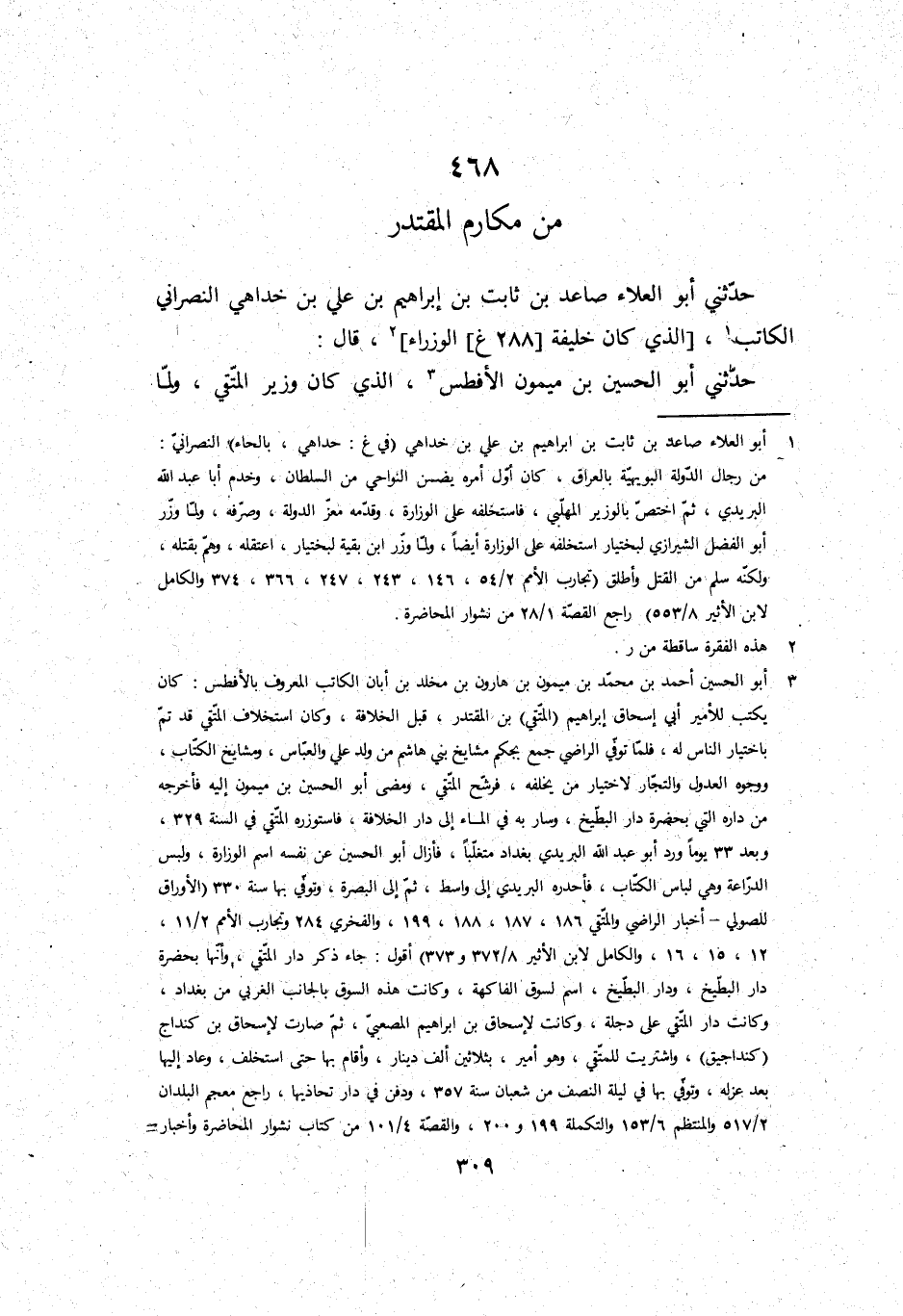 حَدثنِي أَبُو الْعَلَاء صاعد بن ثَابت بن إِبْرَاهِيم بن عَليّ بن خداهي النَّصْرَانِي الْكَاتِب، الَّذِي كَانَ خَليفَة الوزراء، قَالَ: حَدثنِي أَبُو الْحُسَيْن بن مَيْمُون الْأَفْطَس، الَّذِي كَانَ وَزِير المتقي، وَلما