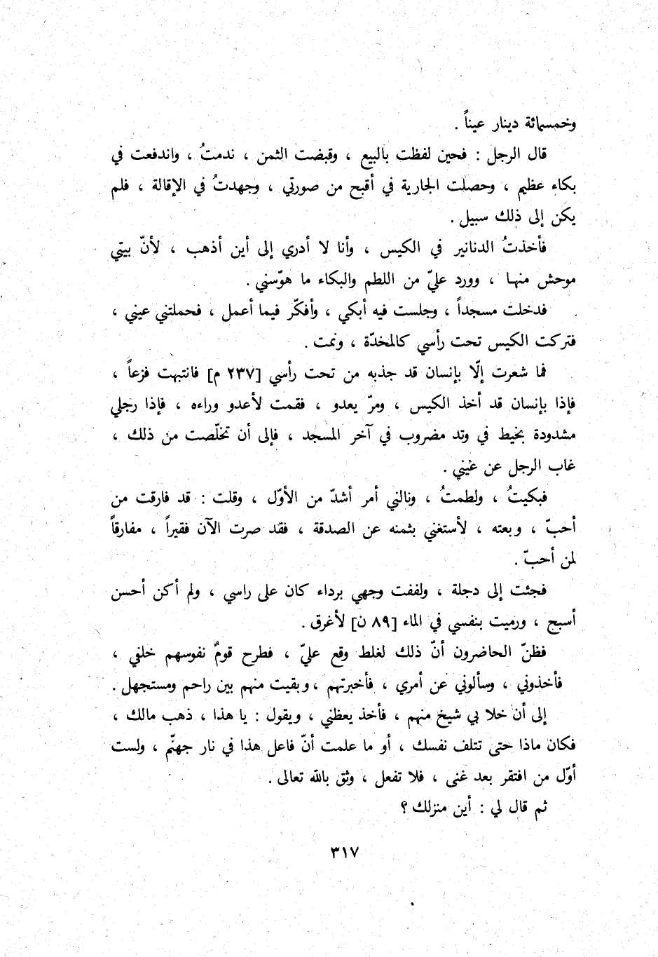 فَأخذت الدَّنَانِير فِي الْكيس، وَأَنا لَا أَدْرِي إِلَى أَيْن أذهب، لِأَن بَيْتِي موحش مِنْهَا، وَورد عَليّ من اللَّطْم والبكاء مَا هوسني.