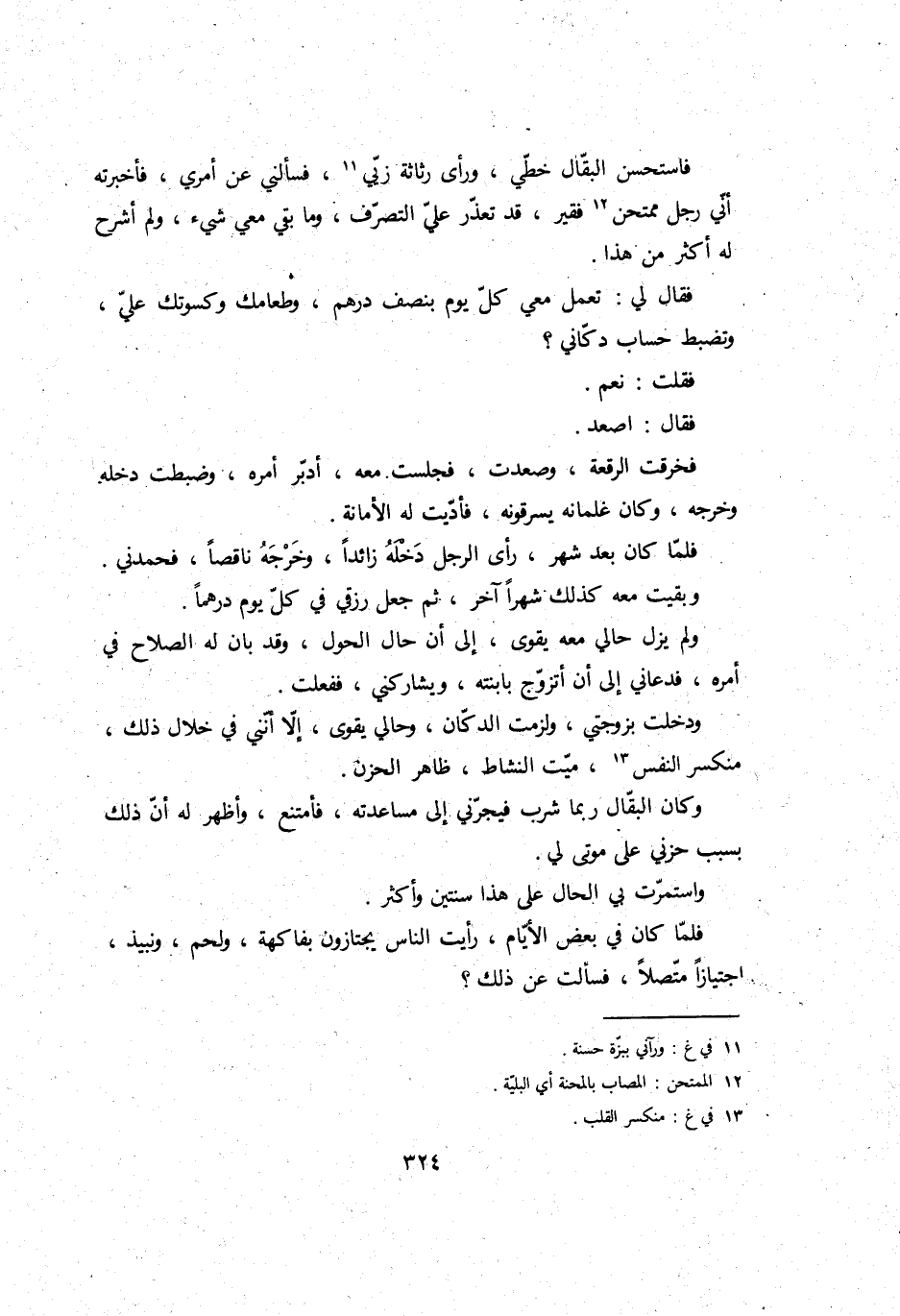 فَاسْتحْسن الْبَقَّال خطي، وَرَأى رثاثة زيي، فَسَأَلَنِي عَن أَمْرِي، فَأَخْبَرته أَنِّي رجل ممتحن فَقير، قد تعذر عَليّ التَّصَرُّف، وَمَا بَقِي معي شَيْء، وَلم أشرح لَهُ أَكثر من هَذَا.