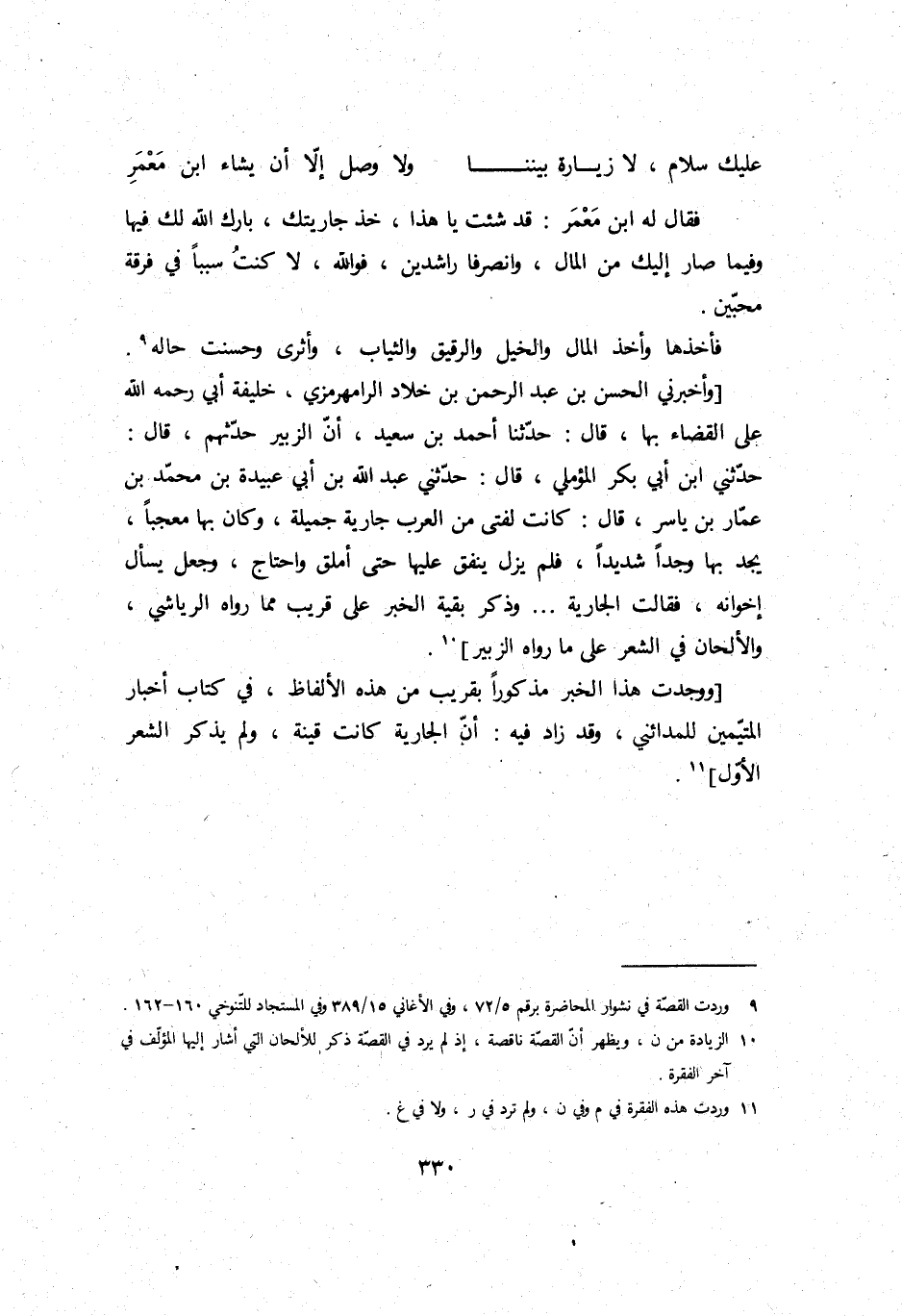 وَأَخْبرنِي الْحسن بن عبد الرَّحْمَن بن خَلاد الرامَهُرْمُزِي، خَليفَة أبي رَحمَه الله على الْقَضَاء بهَا، قَالَ: حَدثنَا أَحْمد بن سعيد، أَن الزبير حَدثهمْ، قَالَ: حَدثنِي ابْن أبي بكر المؤملي، قَالَ: حَدثنِي عبد الله بن أبي عُبَيْدَة بن مُحَمَّد بن عمار بن يَاسر، قَالَ: كَانَت لفتى من الْعَرَب جَارِيَة جميلَة، وَكَانَ بهَا معجبًا، يجد بهَا وجدا شَدِيدا، فَلم يزل ينْفق عَلَيْهَا حَتَّى أملق وَاحْتَاجَ، وَجعل يسْأَل إخوانه، فَقَالَت الْجَارِيَة. . . وَذكر بَقِيَّة الْخَبَر على قريب مِمَّا رَوَاهُ الرياشي، والألحان فِي الشّعْر على مَا رَوَاهُ الزبير.