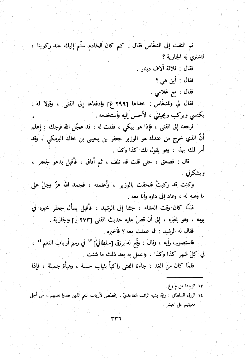 ثمَّ الْتفت إِلَى النخاس، فَقَالَ: كم كَانَ الْخَادِم سلم إِلَيْك عِنْد ركوبنا، لتشتري بِهِ الْجَارِيَة؟ فَقَالَ: ثَلَاثَة آلَاف دِينَار.