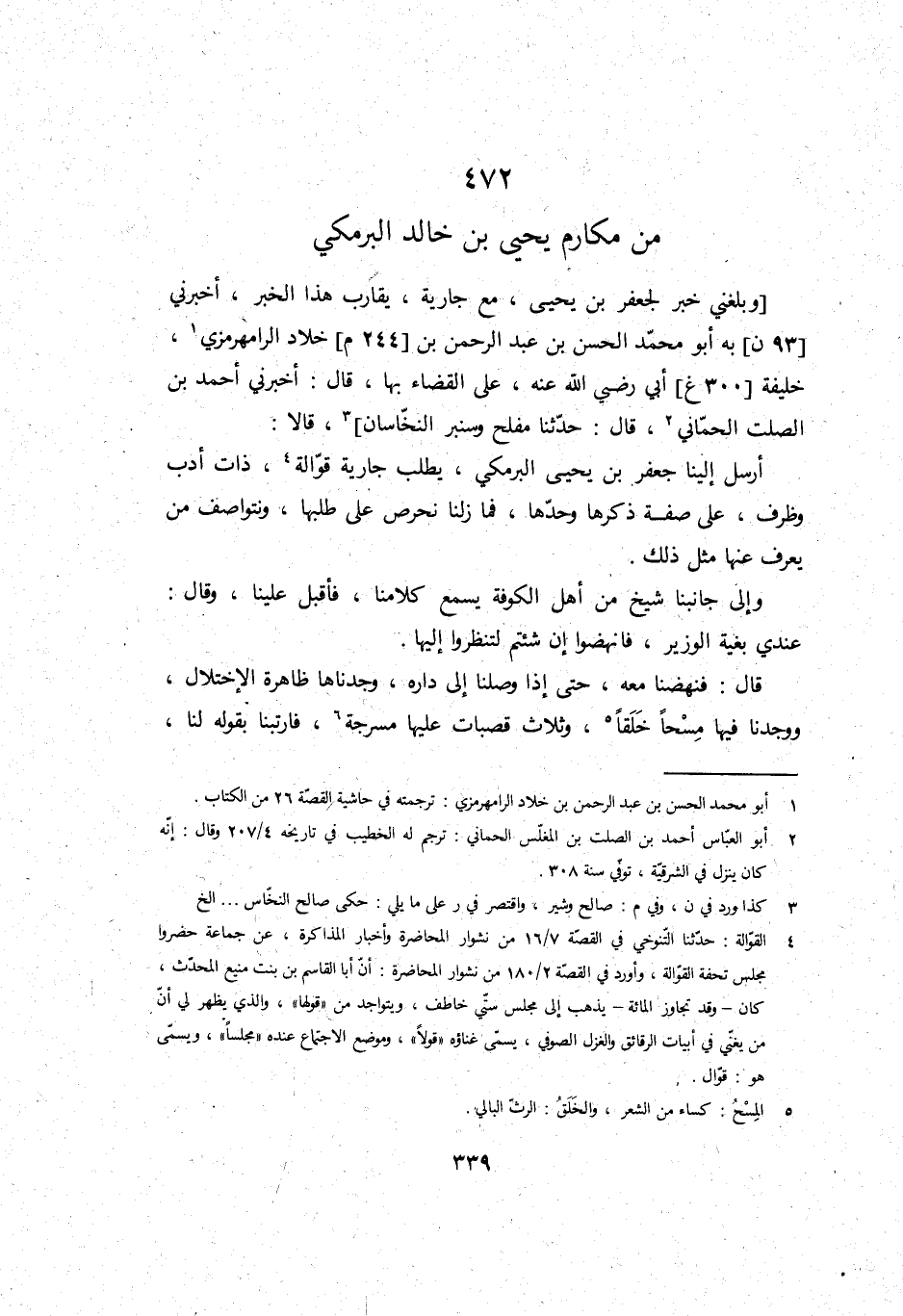 وَبَلغنِي خبر لجَعْفَر بن يحيى، مَعَ جَارِيَة، يُقَارب هَذَا الْخَبَر، أَخْبرنِي بِهِ أَبُو مُحَمَّد الْحسن بن عبد الرَّحْمَن بن خَلاد الرامَهُرْمُزِي، خَليفَة أبي رَضِي الله عَنهُ، على الْقَضَاء بهَا، قَالَ: أَخْبرنِي أَحْمد بن الصَّلْت الْحمانِي، قَالَ: حَدثنَا مُفْلِح وسنبر النخاسان، قَالَا: أرسل إِلَيْنَا جَعْفَر بن يحيى الْبَرْمَكِي، يطْلب جَارِيَة قوالة، ذَات أدب وظرف، على صفة ذكرهَا وَحدهَا، فَمَا زلنا نحرص على طلبَهَا، ونتواصف من يعرف عَنْهَا مثل ذَلِك.