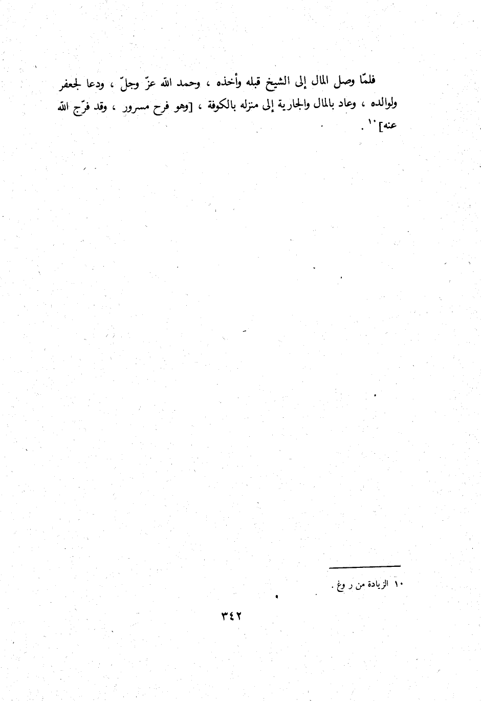 فَلَمَّا وصل المَال إِلَى الشَّيْخ قبله وَأَخذه، وَحمد الله عز وَجل، ودعا لجَعْفَر ولوالده، وَعَاد بِالْمَالِ وَالْجَارِيَة إِلَى منزله بِالْكُوفَةِ، وَهُوَ فَرح مسرور، وَقد فرج الله عَنهُ.