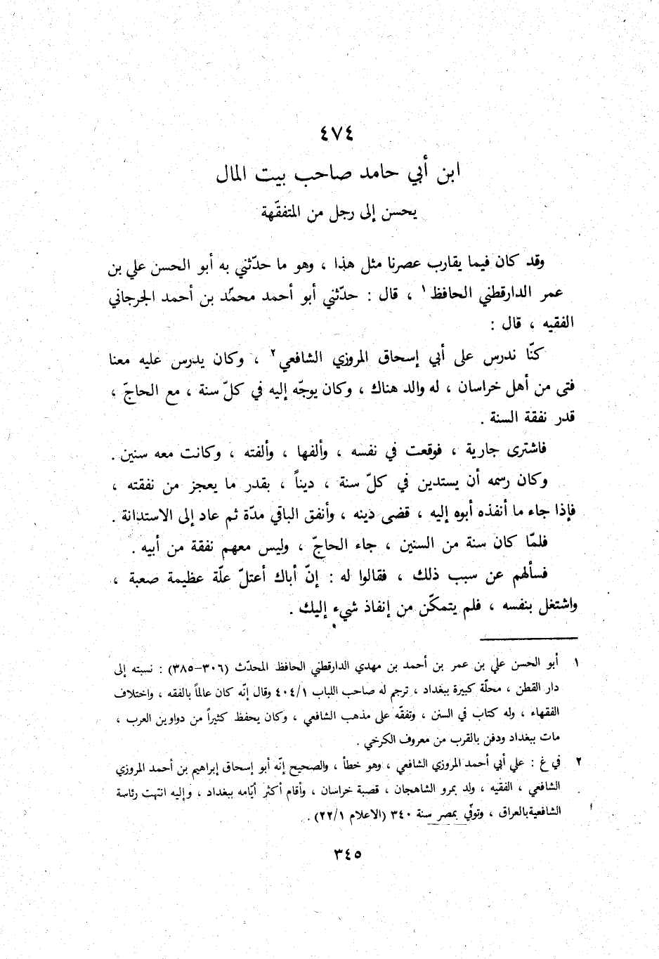 وَقد كَانَ فِيمَا يُقَارب عصرنا مثل هَذَا، وَهُوَ مَا حَدثنِي بِهِ أَبُو الْحسن عَليّ بن عمر الدَّارَقُطْنِيّ الْحَافِظ، قَالَ: حَدثنِي أَبُو أَحْمد مُحَمَّد بن أَحْمد الْجِرْجَانِيّ الْفَقِيه، قَالَ: كُنَّا ندرس على أبي إِسْحَاق الْمروزِي الشَّافِعِي، وَكَانَ يدرس عَلَيْهِ مَعنا فَتى من أهل خُرَاسَان، لَهُ وَالِد هُنَاكَ، وَكَانَ يُوَجه إِلَيْهِ فِي كل سنة، مَعَ الْحَاج، قدر نَفَقَة السّنة.