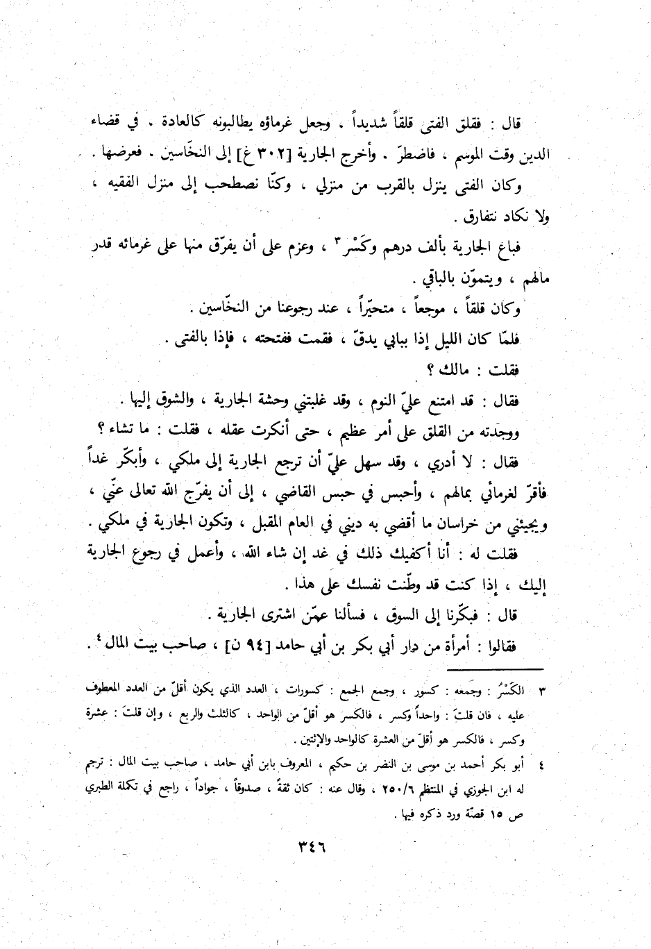 وَوَجَدته من القلق على أَمر عَظِيم، حَتَّى أنْكرت عقله، فَقلت: مَا تشَاء؟ فَقَالَ: لَا أَدْرِي، وَقد سهل عَليّ أَن ترجع الْجَارِيَة إِلَى ملكي، وأبكر غَدا فَأقر لغرمائي بمالهم، وأحبس فِي حبس القَاضِي، إِلَى أَن يفرج الله تَعَالَى عني، ويجيئني من خُرَاسَان مَا أَقْْضِي بِهِ ديني فِي الْعَام الْمقبل، وَتَكون الْجَارِيَة فِي ملكي.