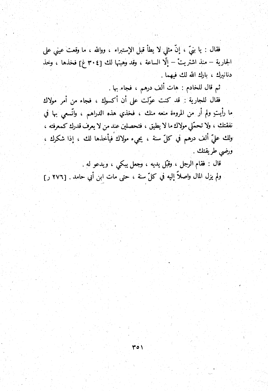 فَقَالَ لِلْجَارِيَةِ: قد كنت عولت على أَن أكسوك، فجَاء من أَمر مَوْلَاك مَا رَأَيْت وَلم أر من الْمُرُوءَة مَنعه مِنْك، فَخذي هَذِه الدَّرَاهِم، واتسعي بهَا فِي نَفَقَتك، وَلَا تحملي مَوْلَاك مَا لَا يُطيق، فتحصلين عِنْد من لَا يعرف قدرك كمعرفته، وَلَك عَليّ ألف دِرْهَم فِي كل سنة، يَجِيء مَوْلَاك فيأخذها لَك، إِذا شكرك، وَرَضي طريقتك.