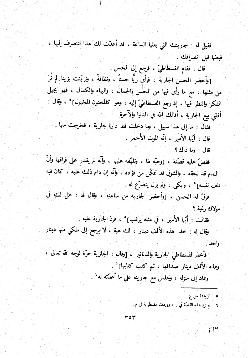 وأحضر الْحسن الْجَارِيَة، فَرَأى زيًا حسنا، ونظافةً، وتزينت بزينة لم تَرَ من مثلهَا، مَعَ مَا رأى فِيهَا من الْحسن وَالْجمال، والبهاء والكمال، فَهُوَ يجيل الْفِكر وَالنَّظَر فِيهَا، إِذْ رَجَعَ الفسطاطي إِلَيْهِ، وَهُوَ كَالْمَجْنُونِ المخبول، وَقَالَ: أَقلنِي بيع الْجَارِيَة، أقالك الله فِي الدُّنْيَا وَالْآخِرَة.
