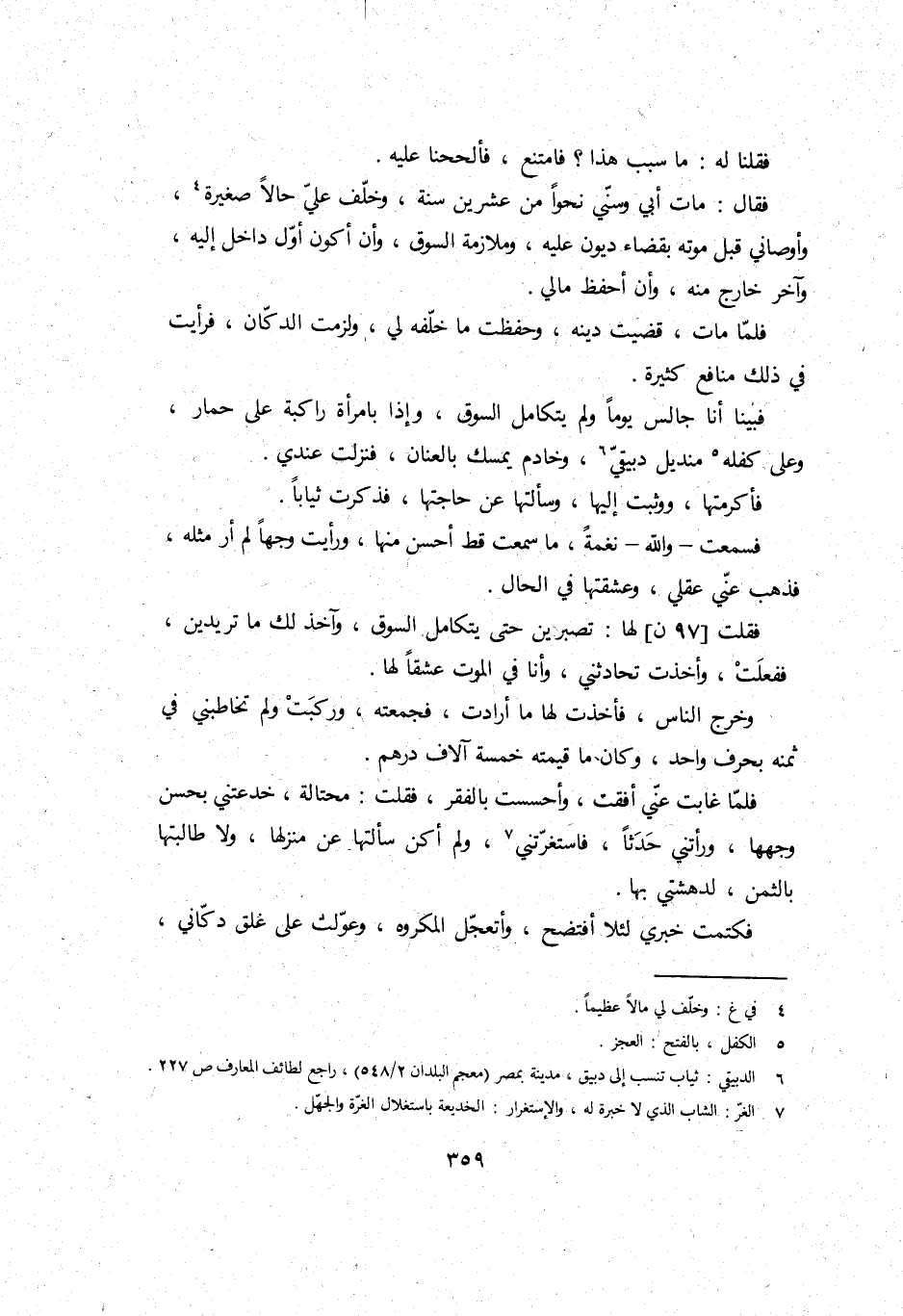 فَلَمَّا غَابَتْ عني أَفَقْت، وأحسست بالفقر، فَقلت: محتالة، خدعتني بِحسن وَجههَا، ورأتني حَدثا، فاستغرتني، وَلم أكن سَأَلتهَا عَن منزلهَا، وَلَا طالبتها بِالثّمن، لدهشتي بهَا.