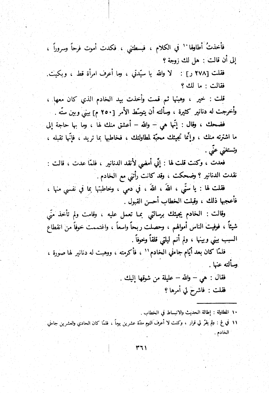 فَأخذت أطاولها فِي الْكَلَام، فبسطتني، فكدت أَمُوت فَرحا وسرورًا، إِلَى أَن قَالَت: هَل لَك زَوْجَة؟ فَقلت: لَا وَالله يَا سيدتي، وَمَا أعرف امْرَأَة قطّ، وبكيت.